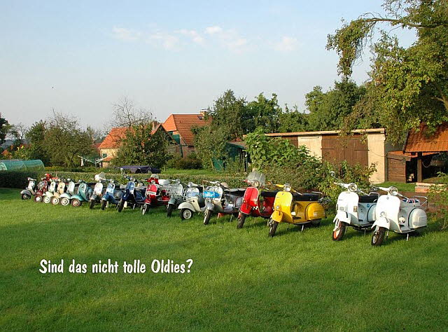 Vespas und 2 Pkws. Bis auf 2 Vespas alles Oldtimer!