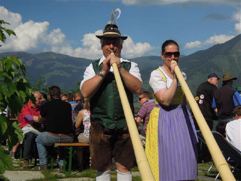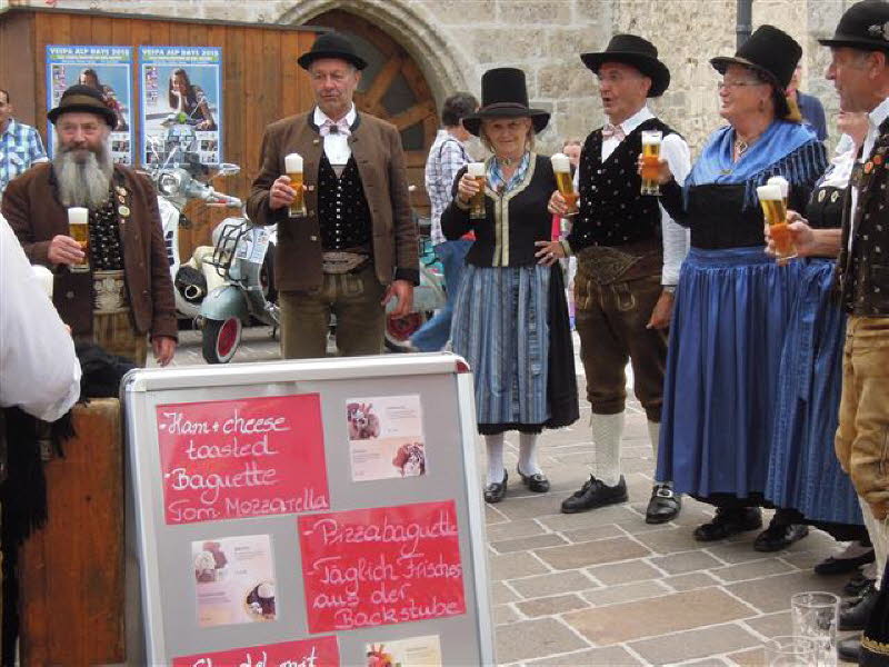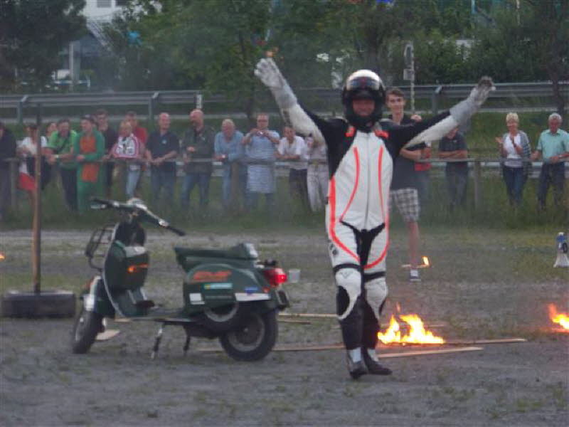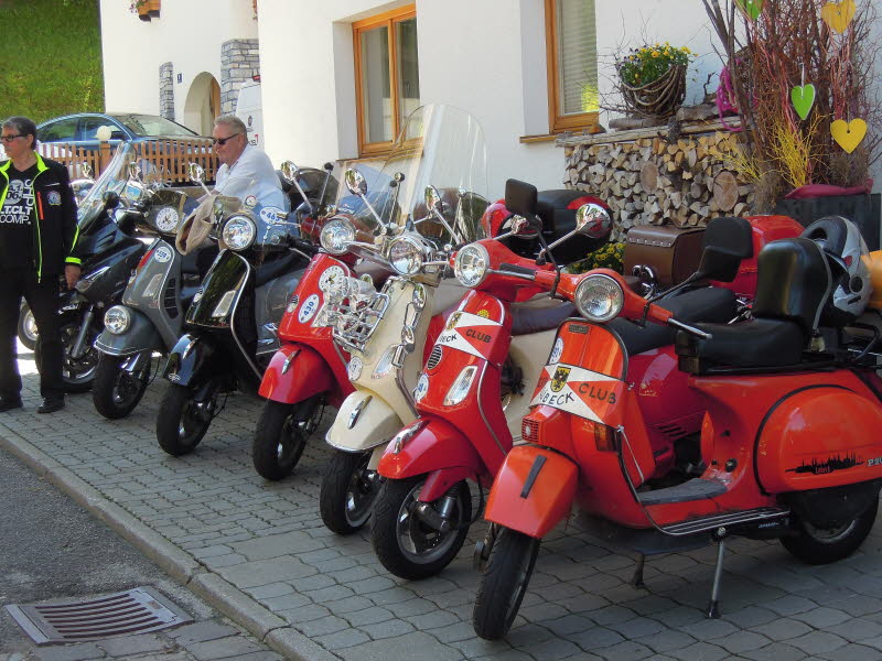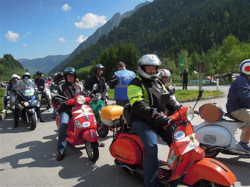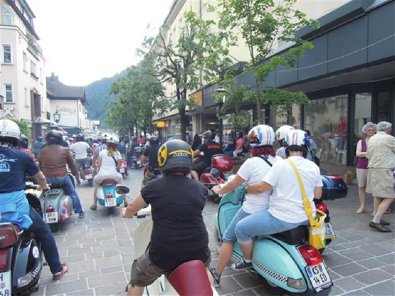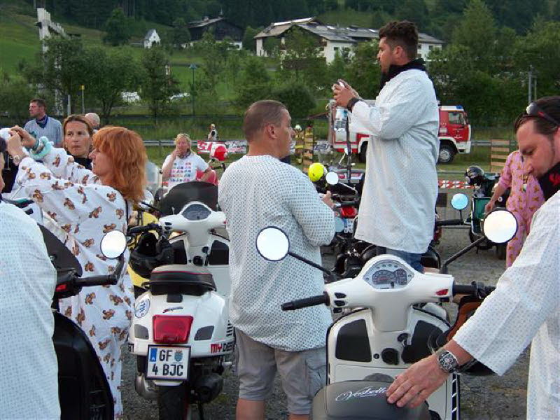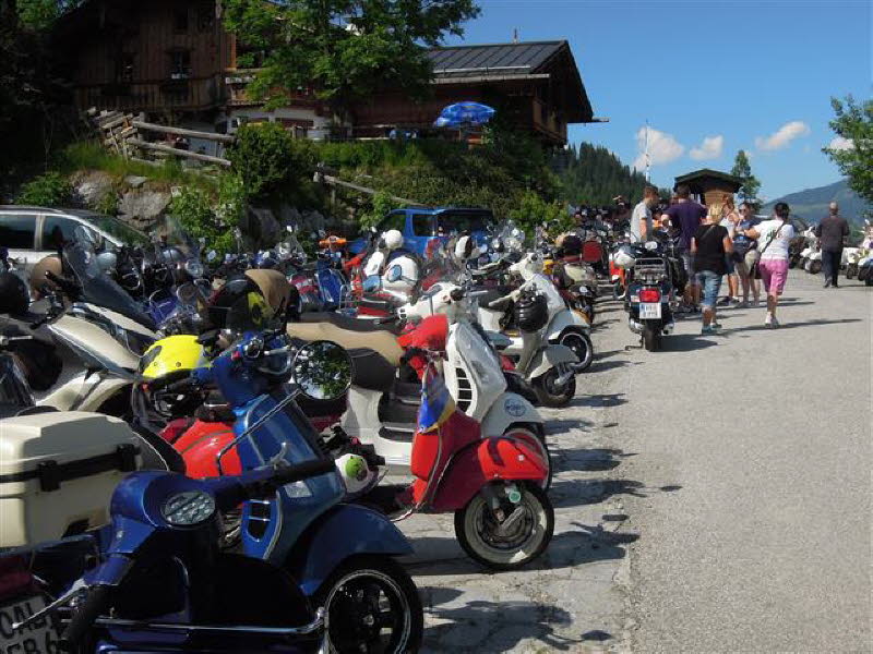 Am 4.6. um 16 Uhr startete die Ausfahrt zur Schober-Alm, mit Speckverkostung und Alphornbläser sowie einer großartigen Aussicht. Treffpunkt der Ausfahrten war immer die Fußgängerzone in Zell am See. Um 20 Uhr ging dann die Pyjama-Ausfahrt nach Schüttdorf los. Hier zeigte der Extrem-Vespa-Stuntman wie er mit seiner Vespa Feuerwände durchschlägt. Leider hat das ganze nur 10 Sekunden gedauert. Den Abschluss bildete für uns die 20-minütige Laser-Licht-Musik-Show an der Seepromenade.