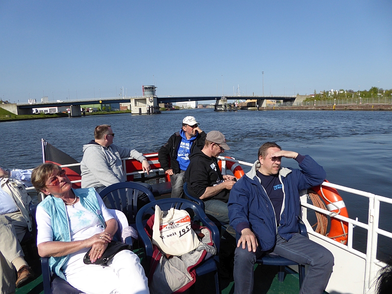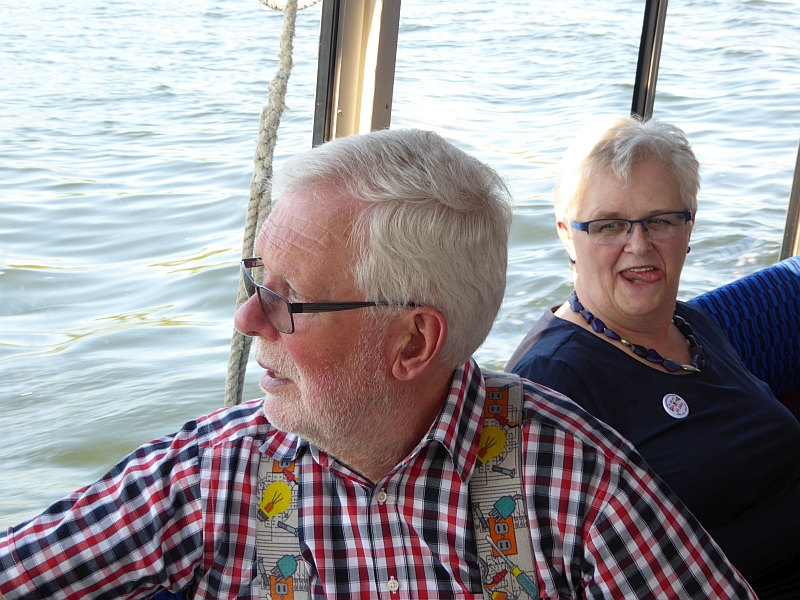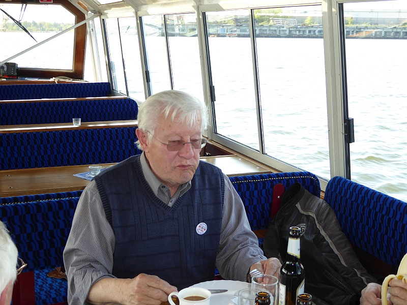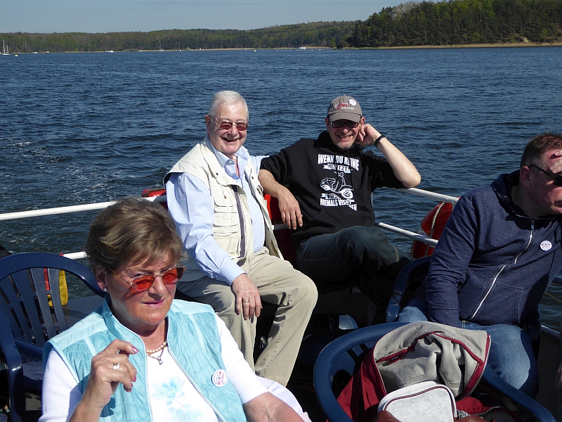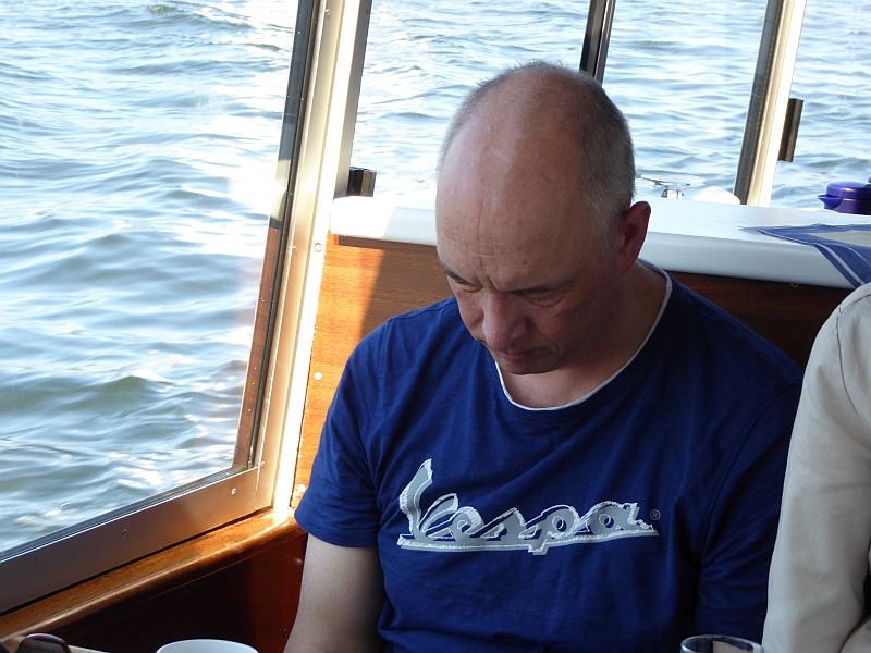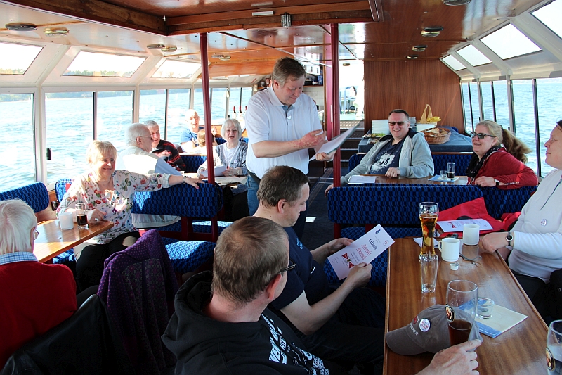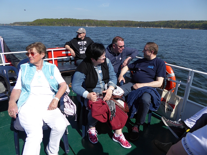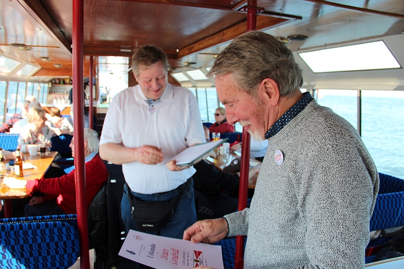 Alle anderen – inklusive Frank D. von der Bäderbande, die dieses Jahr auch 5-jähriges Bestehen feiert – haben aber die Fahrt zum Teil auf dem sonnigen Achterdeck sehr genossen. Auch die Grundausstattung an Beuteltaschen und Aufklebern anlässlich unseres 60-jährigen kam gut an (Mitglieder, die nicht dabei waren, mussten bis Juni warten). Bei den Schokolade-Täfelchen kamen einige ins Zweifeln, ob man sie lieber essen oder aufheben sollte. Sie schmecken ganz gut, und es wurde in Hinblick auf die VWD in Celle noch von allem eine Extraportion zum Verkauf gefertigt. Also guten Appetit