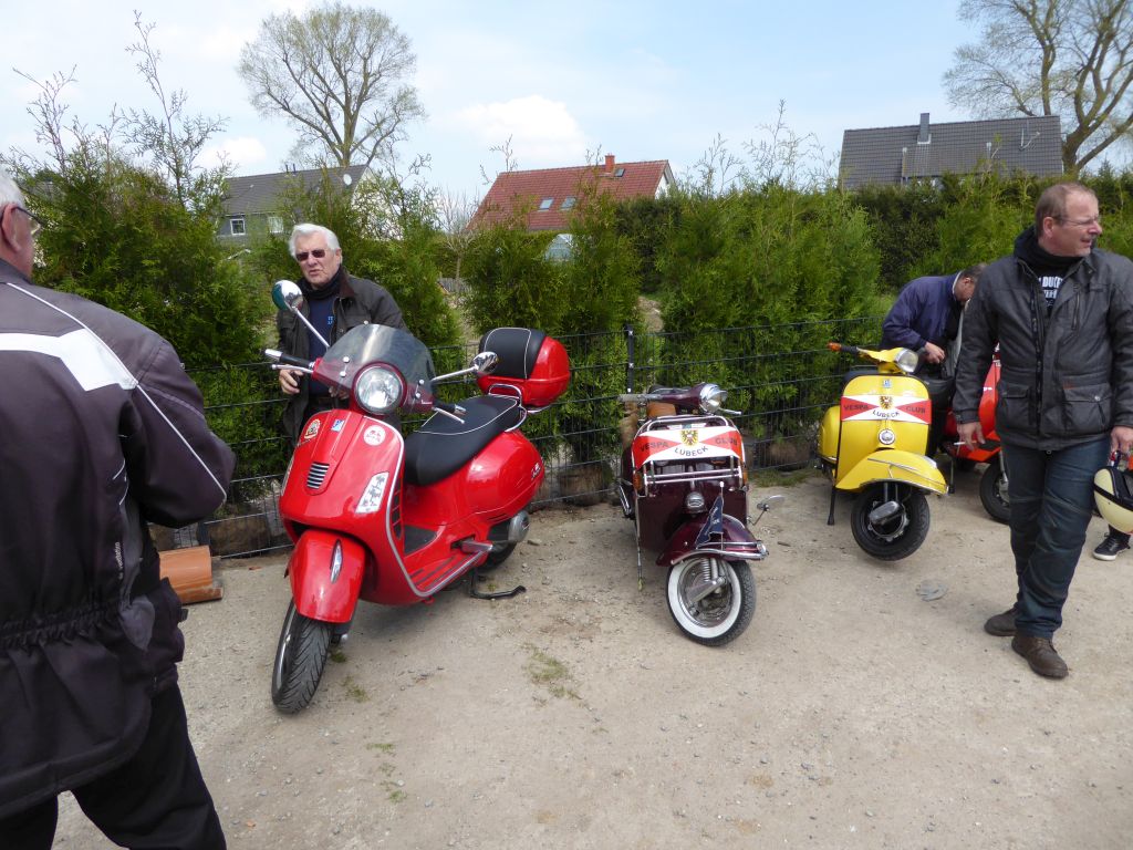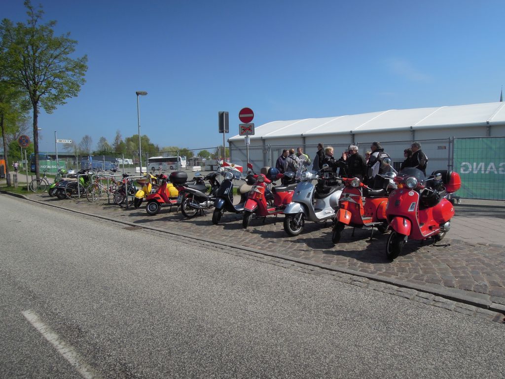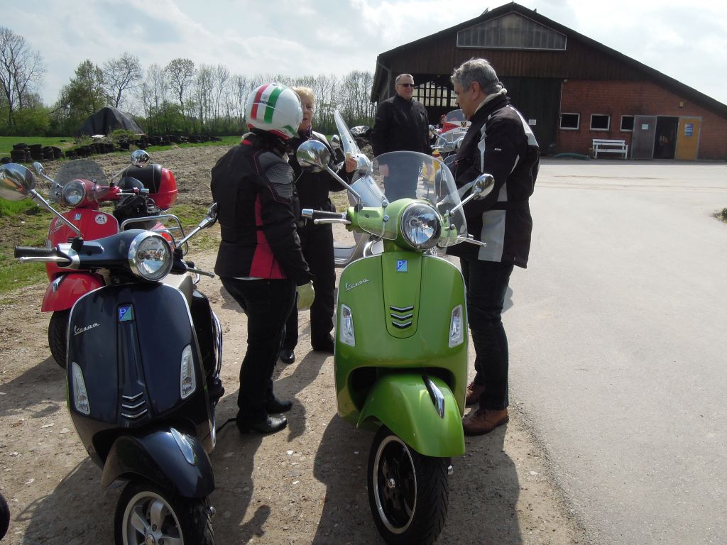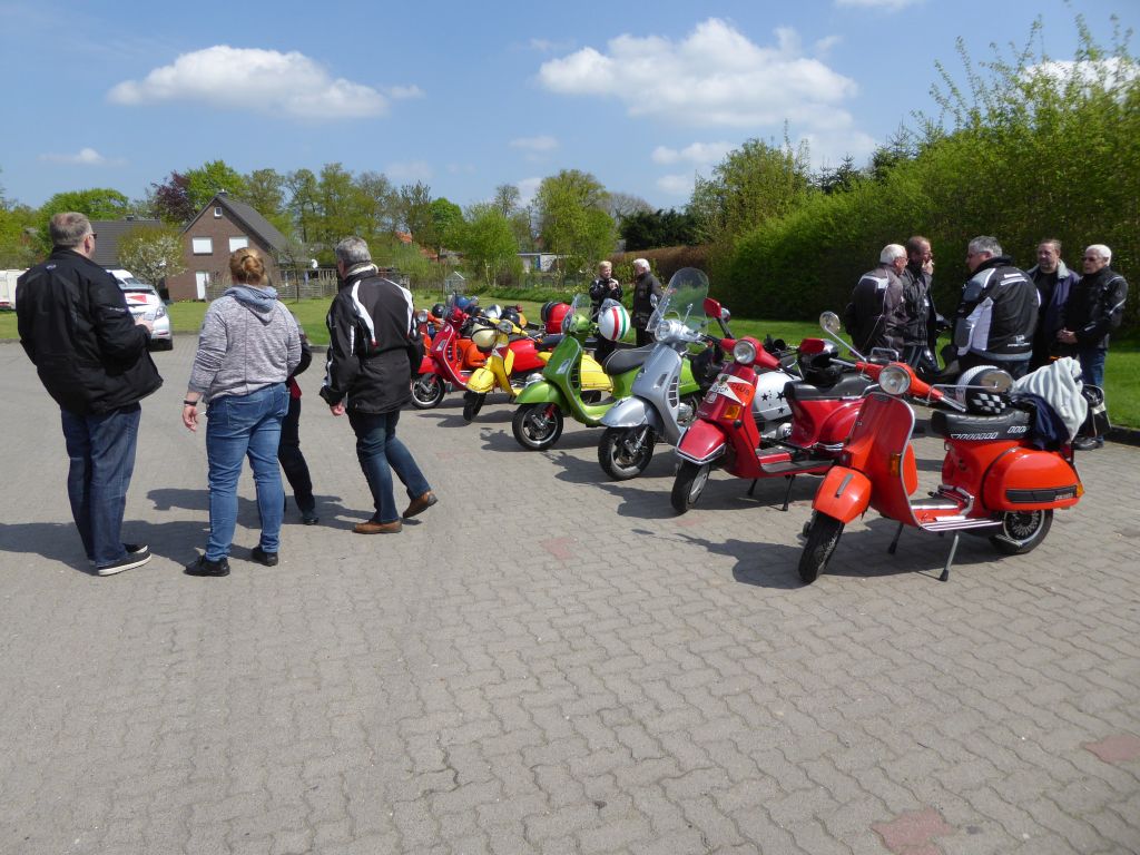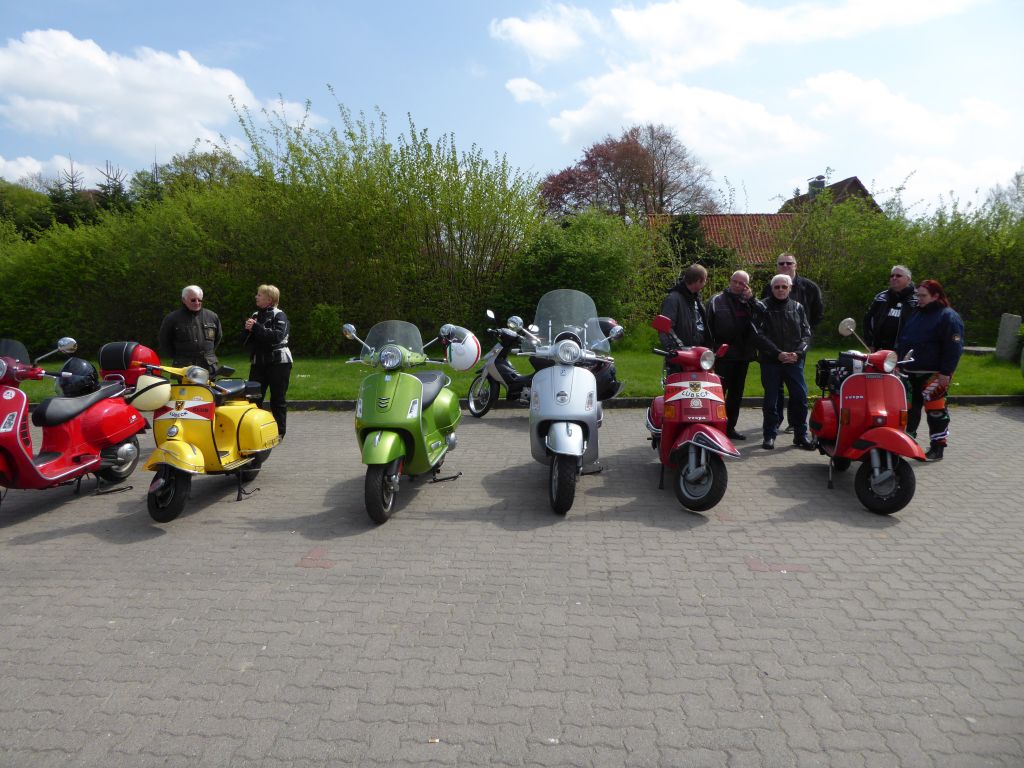 Wir starteten mit 11 Rollern (davon ein Suzuki, weil Alex es mit seinen eigenen Vespen einfach noch nicht zum TÜV geschafft hatte), und einem voll besetzten Auto zu einer entspannten Tour von der MUK über Niendorf, Krummesse, und weitere Dörfer bis nach Quaal bei Bad Segeberg.