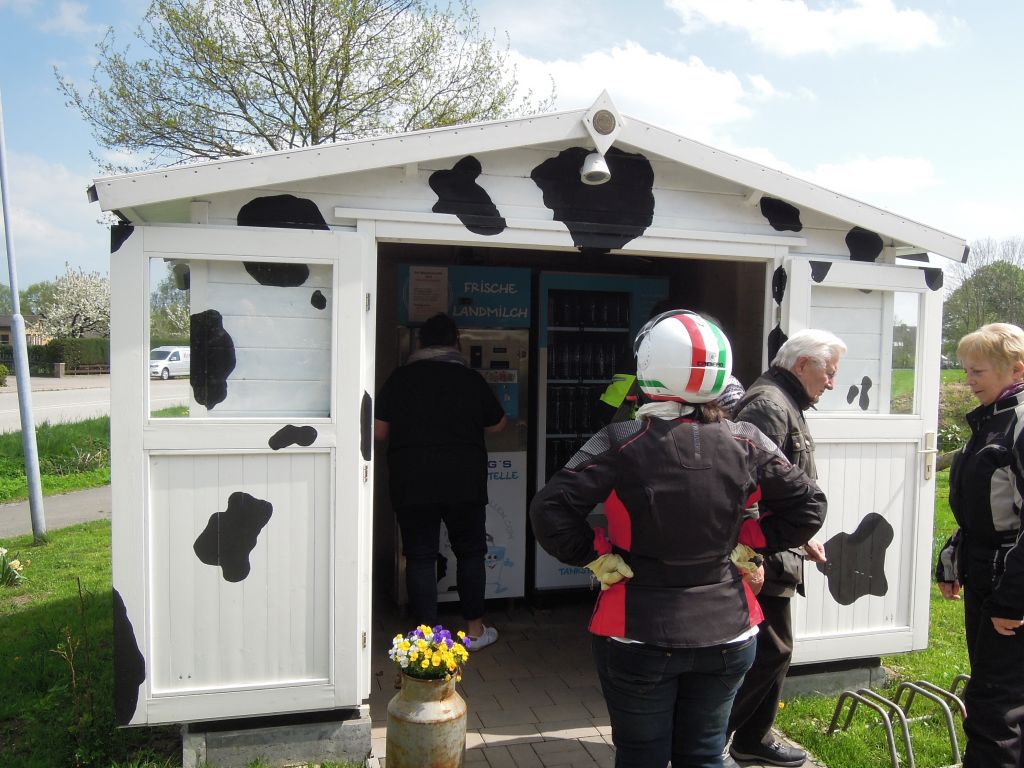 Wenige Kilometer weiter gab es schon den nächsten Stopp an einer Milch-Tankstelle, wo leckere Rohmilch (auf eigene Gefahr) gezapft und verteilt wurde. Dann wurden aber doch noch ein paar Kilometer zum Café Ehrgarten zurückgelegt, wo Anne und Arno mit dem Motorradgespann schon warteten.