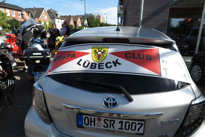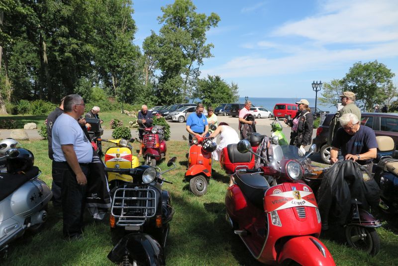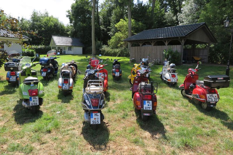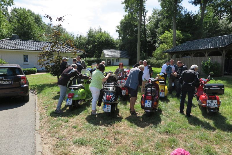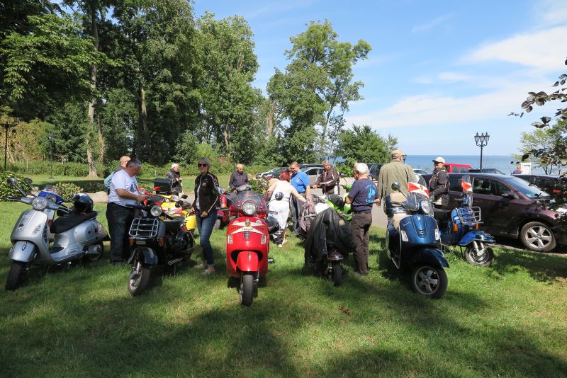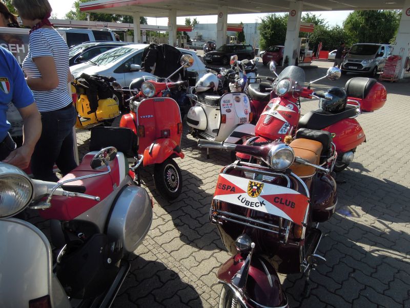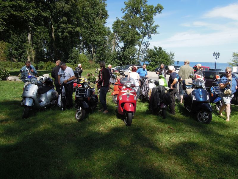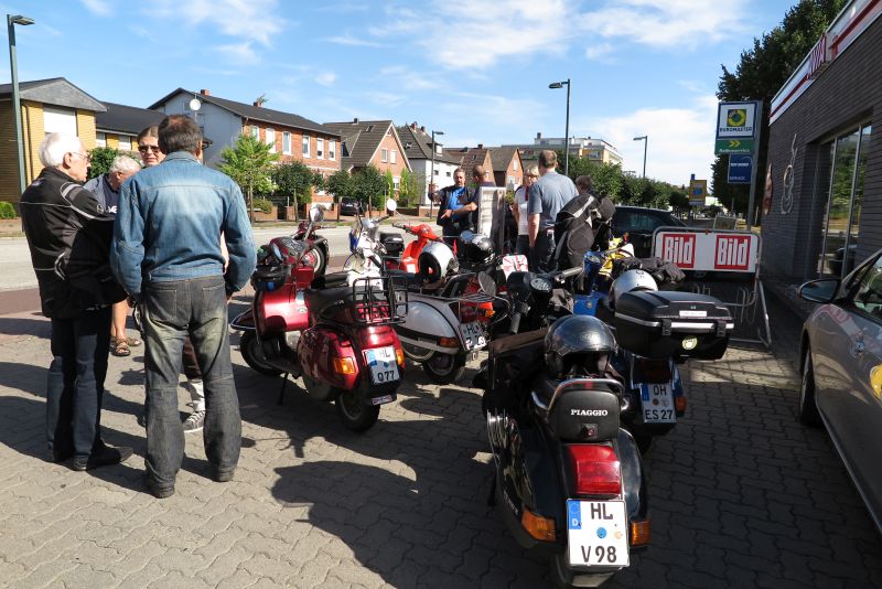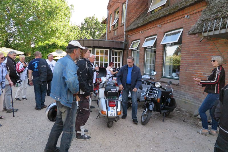 Um 9.45 Uhr starteten wir von der Avia Tankstelle Tremskamp in Bad Schwartau. Wir waren 14 Motorroller und 1 Pkw (unser Begleitfahrzeug, das wie immer Sabine fuhr, insgesamt 18 Personen. Eine erste Kaffeepause machten wir, nach ca. 57 km, im Kum-Luk Nordstrand in Dahme. Nach weiteren 58 km trudelten wir im Waldpavillon am Meer auf Fehmarn ein. Dort haben wir dann unsere Mittagspause, mit herrlichem Blick auf die Ostsee und gutem Essen genossen. Von dort begann dann die Rückfahrt mit einem Tankstopp in Burg auf Fehmarn. Die Fahrt ging dann weiter bis zum Landgasthof Kasch in Malente zur Kaffeepause. Dort hatte Olaf schon vorher zwei Torten reservieren lassen, damit auch keiner von uns Hunger leiden muss. Die Fahrt endete dann wieder an der Avia Tankstelle in Bad Schwartau gegen 19.Uhr. Einige hatten sich schon vorher verabschiedet, um einen kürzeren Heimweg zu haben.