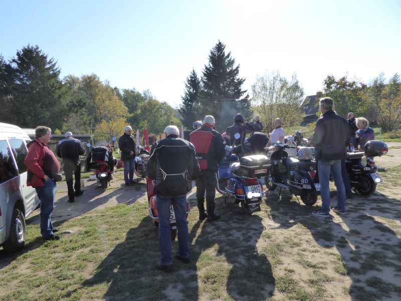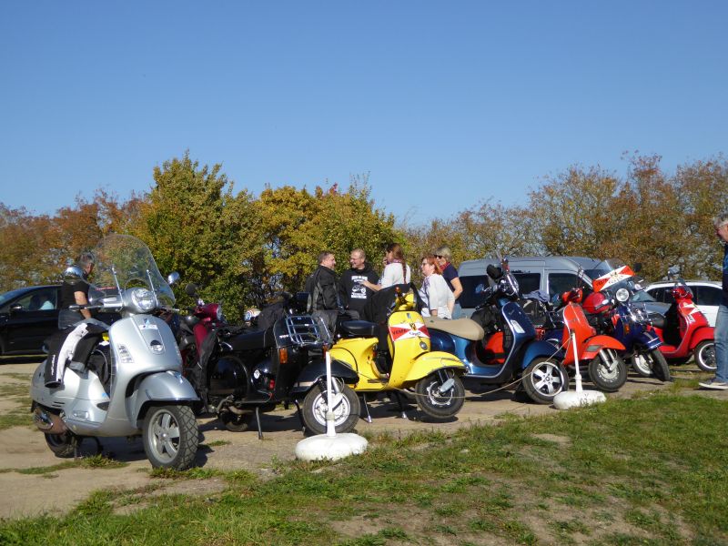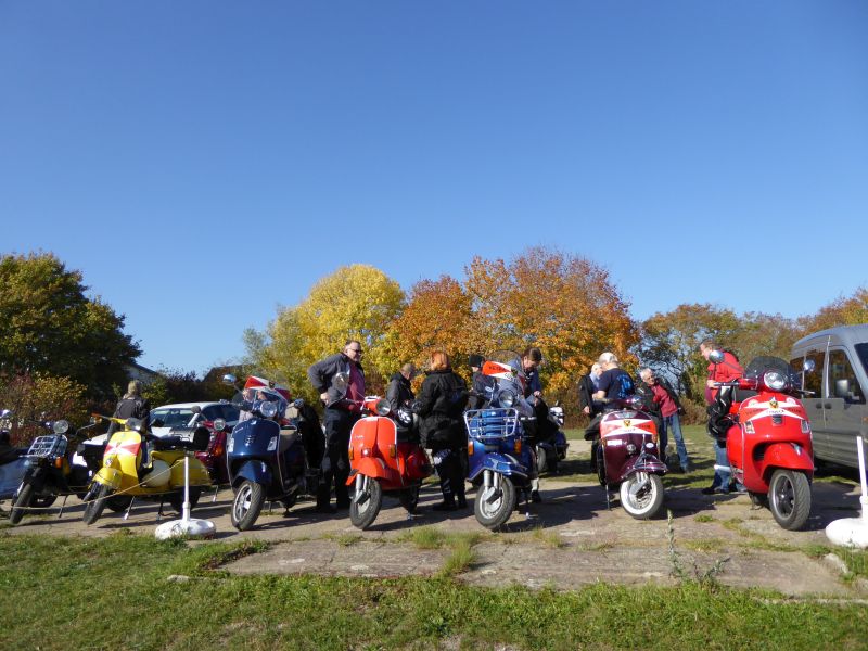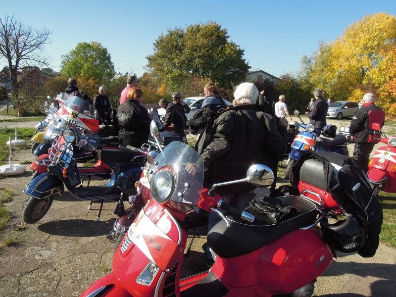 Bei schönstem Wetter versammelten sich 22 Personen mit 14 Rollern und zwei Autos pünktlich in Bad Schwartau an der Avia. Gerd kämpfte noch ein wenig mit Resten einer Erkältung und hatte spontan entschieden, die Ausfahrt mit dem Auto anzuführen, damit er am nächsten Tag im Büro noch einen längeren Vortrag halten kann.