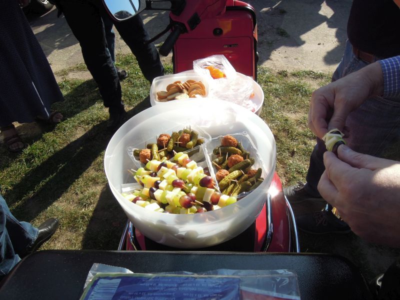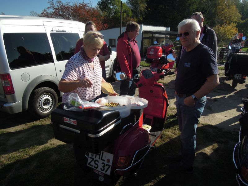 Eigentlich sollte es nach Travemünde zur Fähre gehen; aber gut informierte Mitglieder wussten, dass die wegen eines Marathons bis 14 Uhr gesperrt ist. So ging es eben auf dem Landweg nach Harkensee zum Zwischenstopp in einer guten Eisdiele. Petra gab auf dem Parkplatz zunächst noch einige Leckereien aus. Aber das hält echte Kaffee-Tanten ja nicht davon ab, noch einen Kaffee zu trinken und das weitere Angebot zu begutachten.