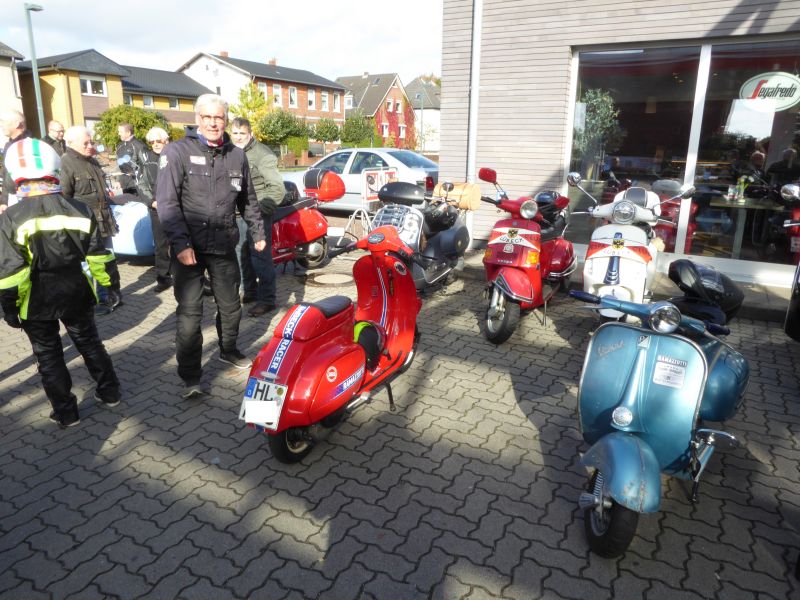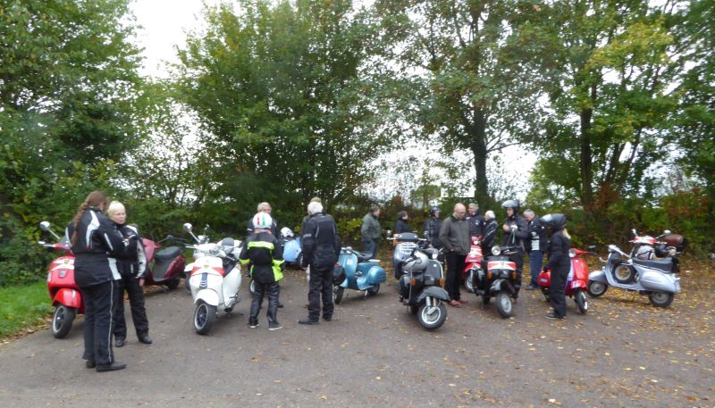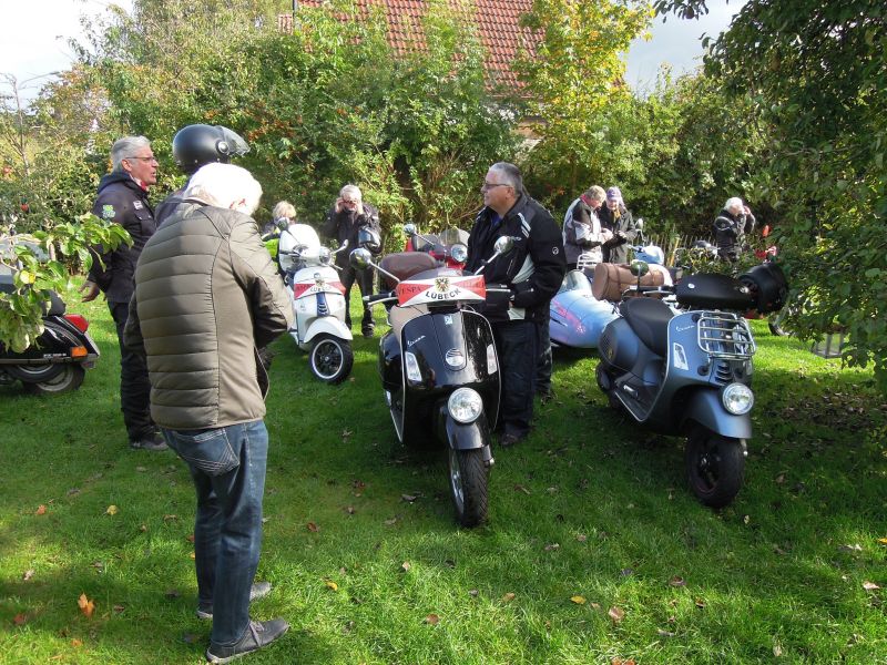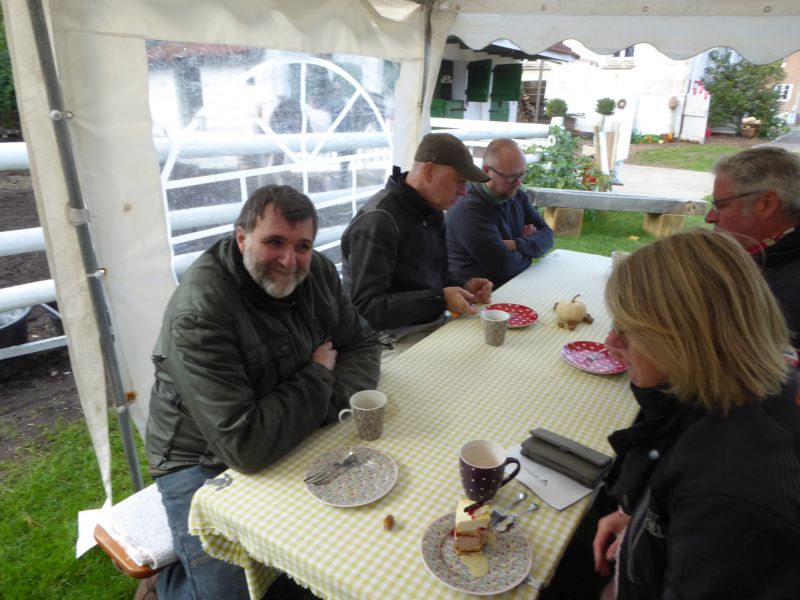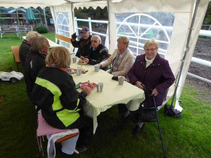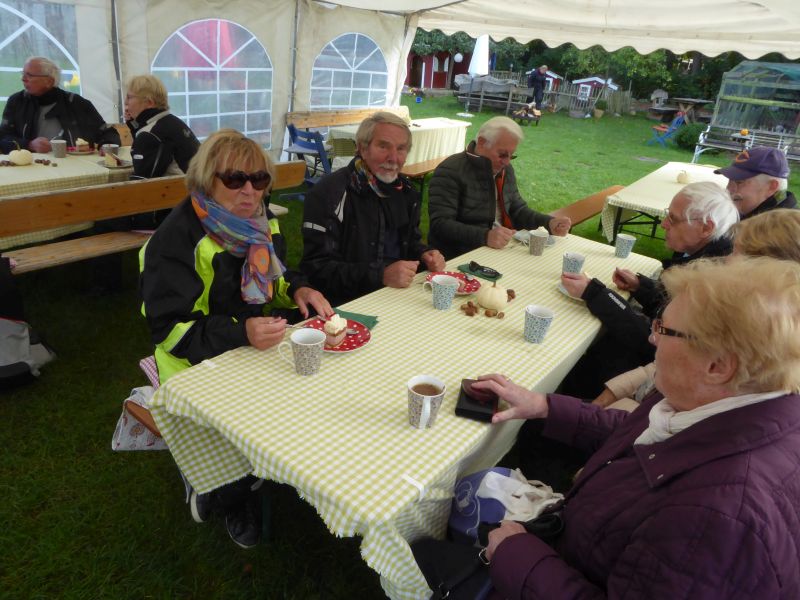 Von der relativ großen Gruppe haben einige nur die Fahrt mitgemacht, aber dafür kamen einige andere ohne Roller auch direkt zum Cafe, um in einem Zeltling trocken und gut belüftet ganz leckere Torte, Wild-Würstchen und Pommes zu genießen.
