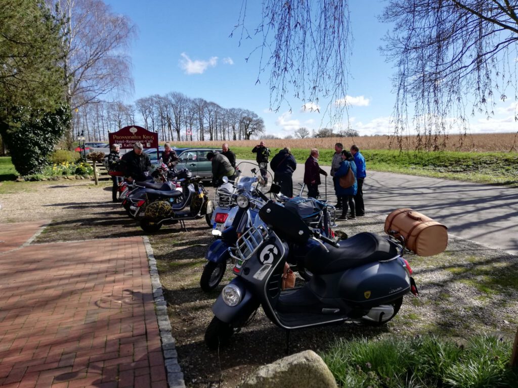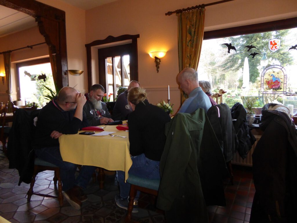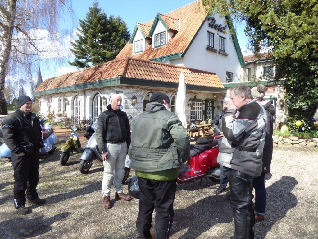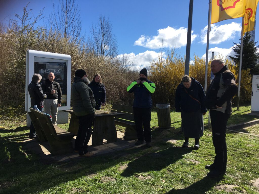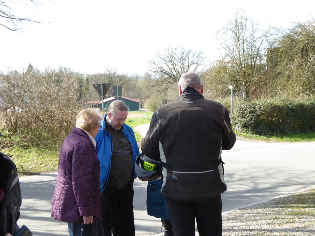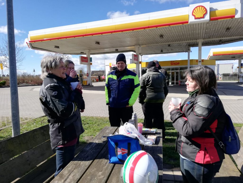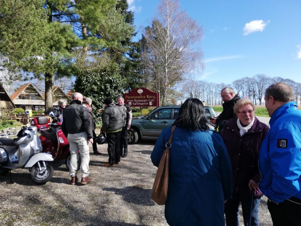 Darunter waren auch als Gäste Jo aus Rahlstedt und Roy aus Kaltenkirchen, der somit schon die weiteste und sicher kälteste Anfahrt hatte. Mit Roys originalem 80er waren wir tatsächlich nur ein kleines Bisschen langsamer unterwegs als sonst. Wir haben für die erste Etappe nicht die längste Route gewählt, sodass genug Zeit für eine Pause mit heissem Tee zum Aufwärmen blieb. Simone fuhr mit ihren Sommerhandschuhen lieber direkt in der Sonne nach Hause, als der Rest zur Runde um den Wardersee aufbrach. Von der Abkürzung zum Pronstorfer Krug machte niemand Gebrauch, sodass wir pünktlich gemeinsam mit den per Auto angereisten ankamen und uns lange sehr gemütlich unterhalten und gut verköstigen konnten.
