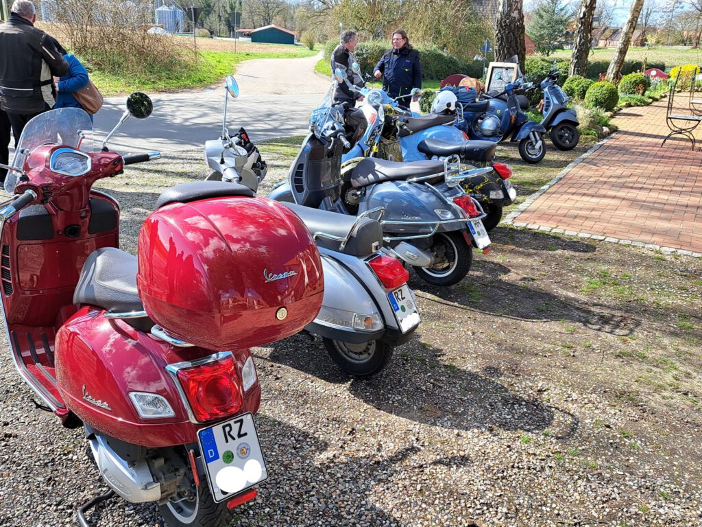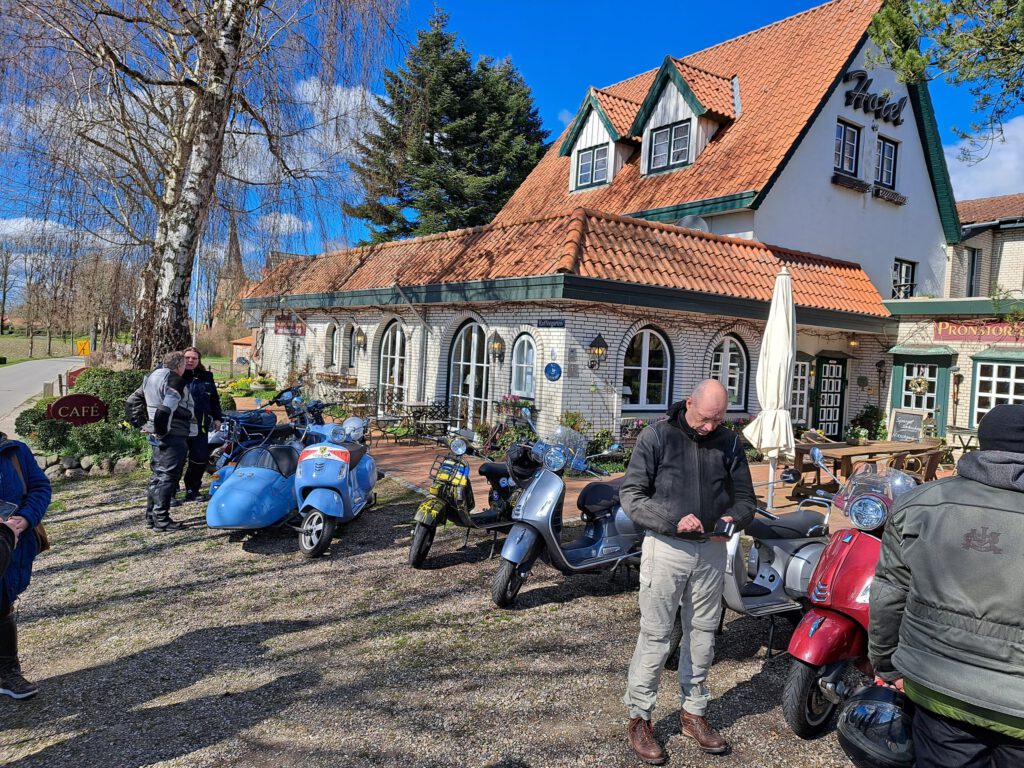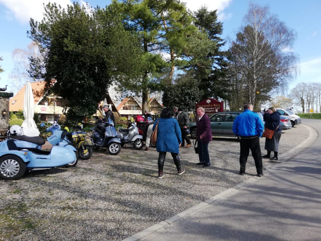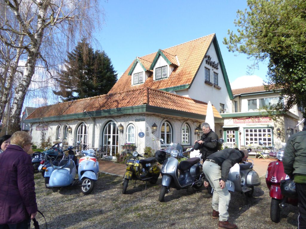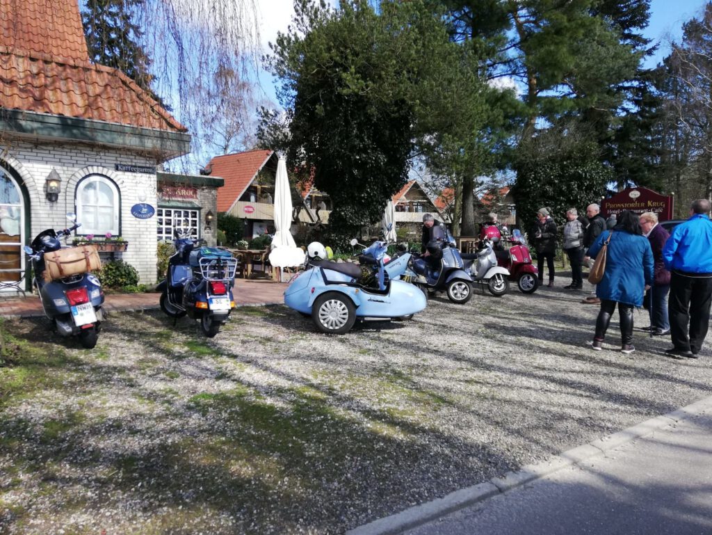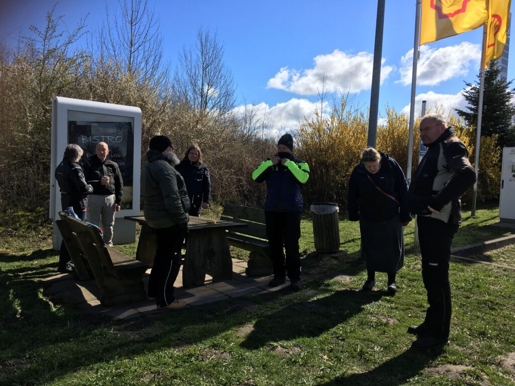 Darunter waren auch als Gäste Jo aus Rahlstedt und Roy aus Kaltenkirchen, der somit schon die weiteste und sicher kälteste Anfahrt hatte. Mit Roys originalem 80er waren wir tatsächlich nur ein kleines Bisschen langsamer unterwegs als sonst. Wir haben für die erste Etappe nicht die längste Route gewählt, sodass genug Zeit für eine Pause mit heissem Tee zum Aufwärmen blieb. Simone fuhr mit ihren Sommerhandschuhen lieber direkt in der Sonne nach Hause, als der Rest zur Runde um den Wardersee aufbrach. Von der Abkürzung zum Pronstorfer Krug machte niemand Gebrauch, sodass wir pünktlich gemeinsam mit den per Auto angereisten ankamen und uns lange sehr gemütlich unterhalten und gut verköstigen konnten.