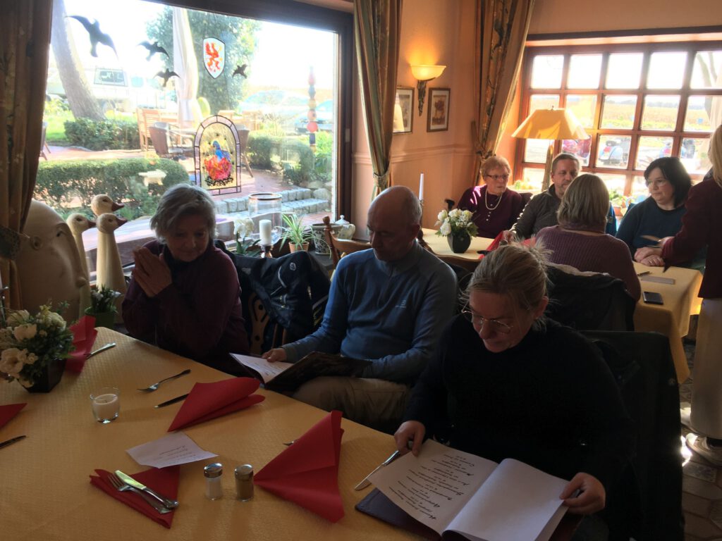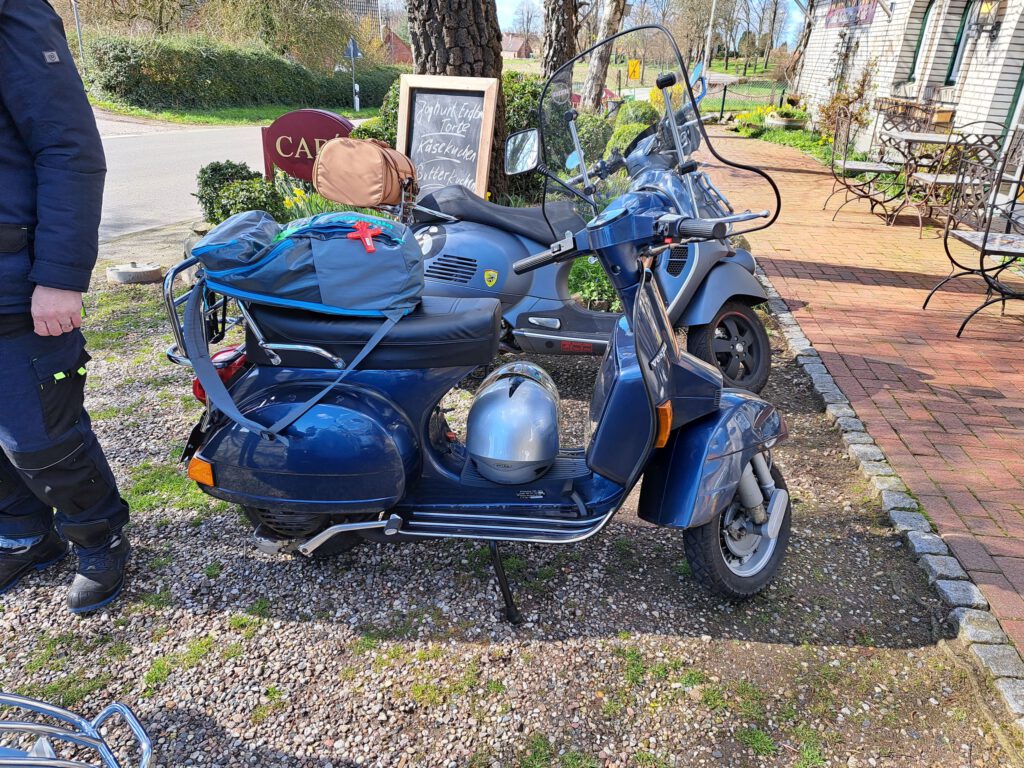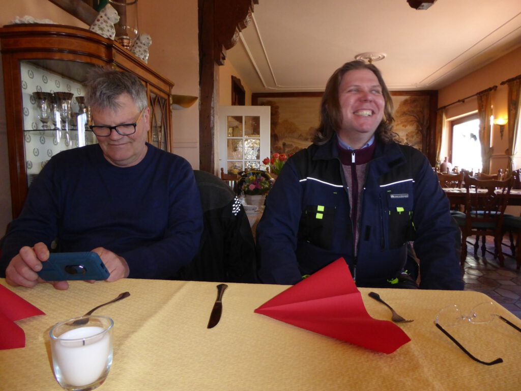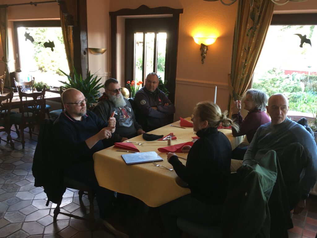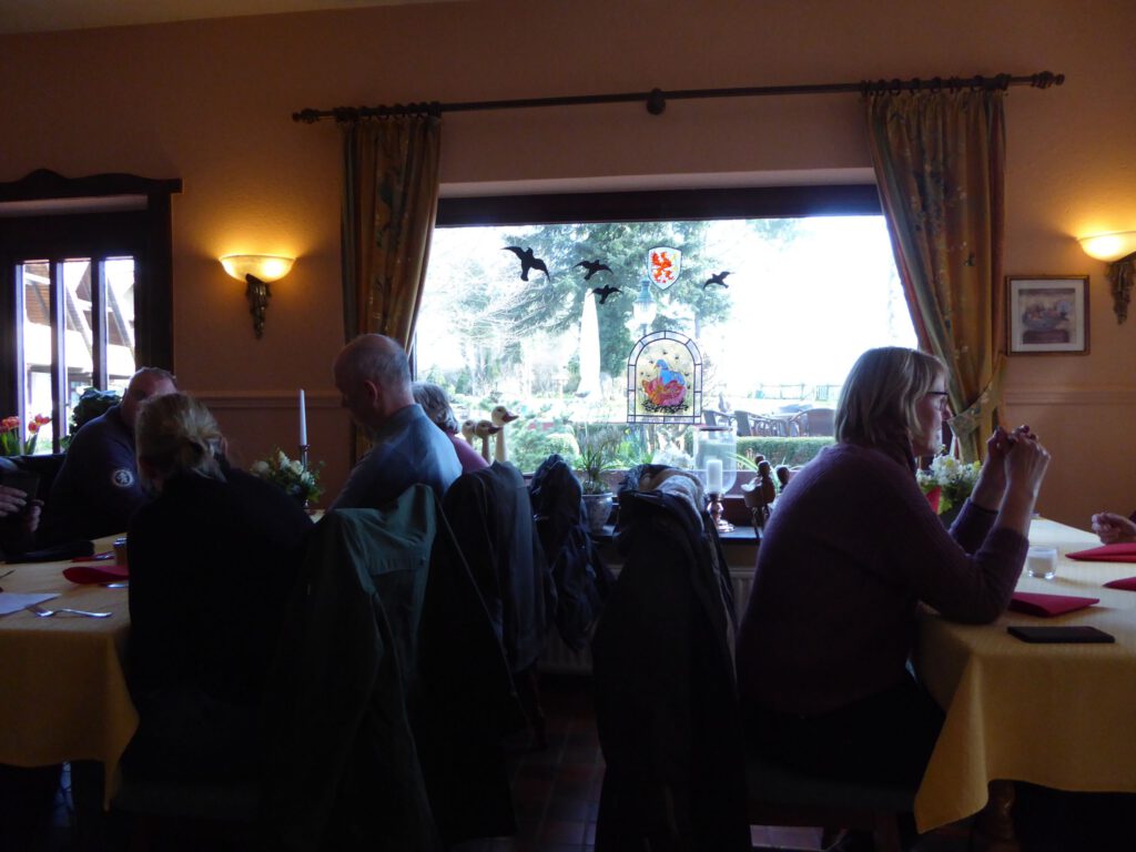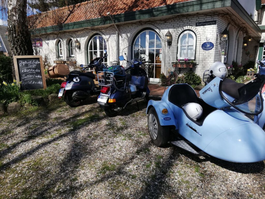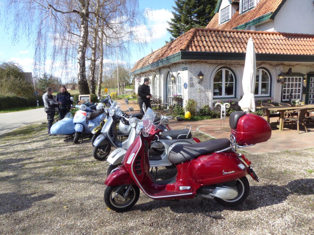 Darunter waren auch als Gäste Jo aus Rahlstedt und Roy aus Kaltenkirchen, der somit schon die weiteste und sicher kälteste Anfahrt hatte. Mit Roys originalem 80er waren wir tatsächlich nur ein kleines Bisschen langsamer unterwegs als sonst. Wir haben für die erste Etappe nicht die längste Route gewählt, sodass genug Zeit für eine Pause mit heissem Tee zum Aufwärmen blieb. Simone fuhr mit ihren Sommerhandschuhen lieber direkt in der Sonne nach Hause, als der Rest zur Runde um den Wardersee aufbrach. Von der Abkürzung zum Pronstorfer Krug machte niemand Gebrauch, sodass wir pünktlich gemeinsam mit den per Auto angereisten ankamen und uns lange sehr gemütlich unterhalten und gut verköstigen konnten.