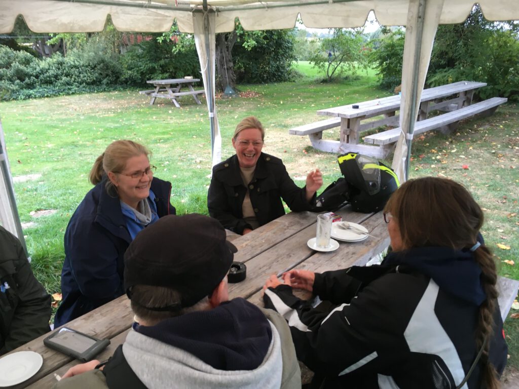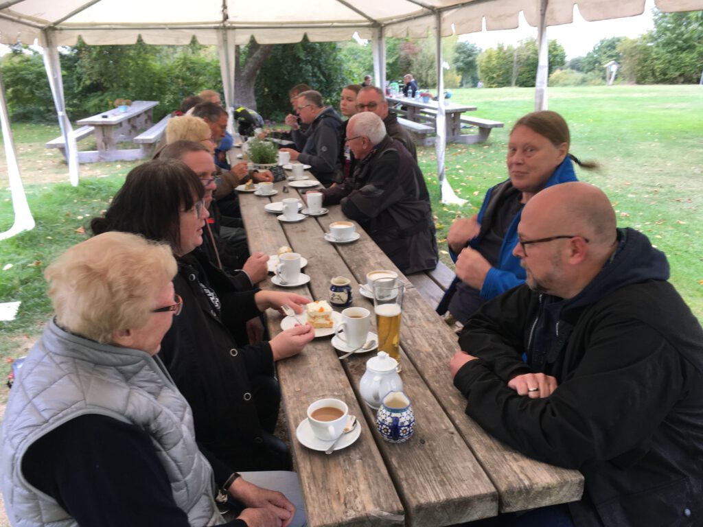 Mit einigen Schlenkern und einer (geplanten) Extrarunde kurz vorm Ziel kamen wir sehr pünktlich gemeinsam mit 5 Leuten in 2 Autos im Café Uppen Barg an, wo uns eine sehr lange Tafel unter einem Zeltdach erwartete. Ein wenig später kam sogar noch eine Autofahrerin dazu. Wir sorgten also für etwas Umsatz und dürfen wieder kommen 😄