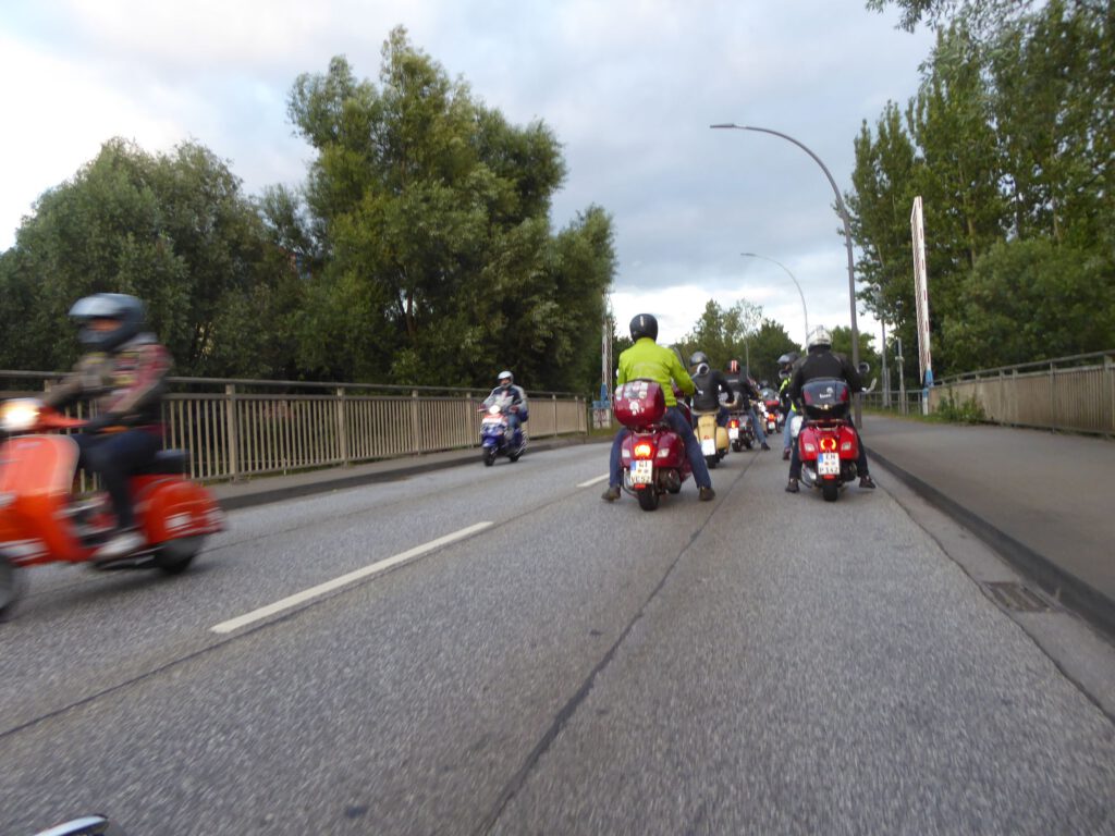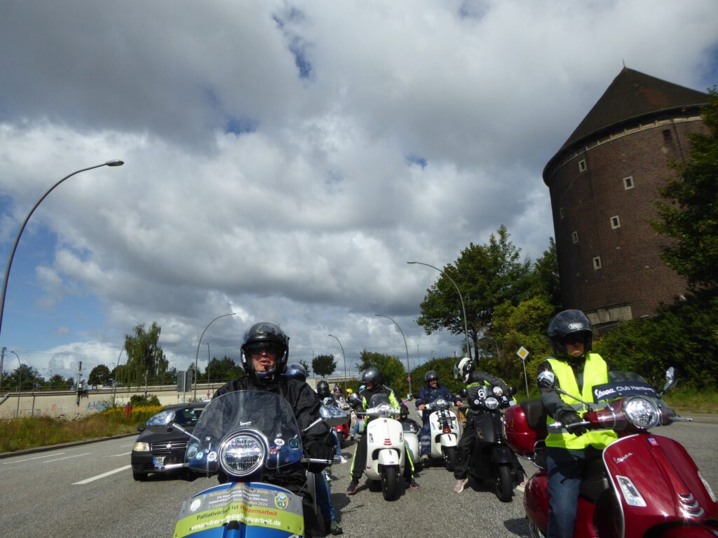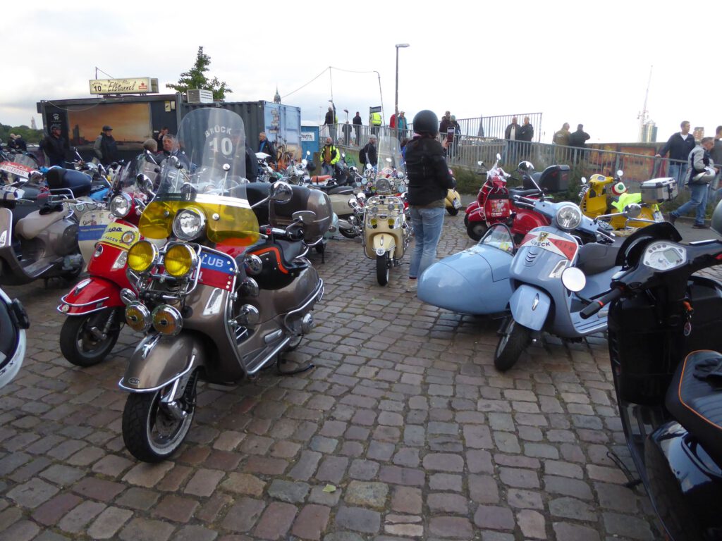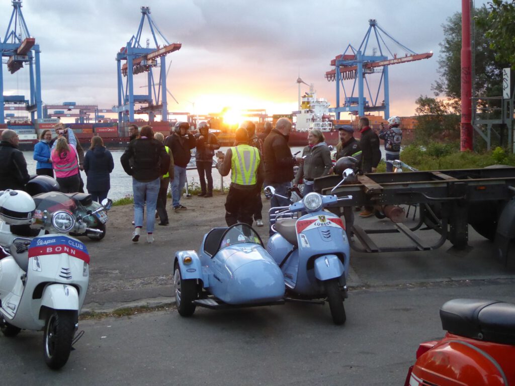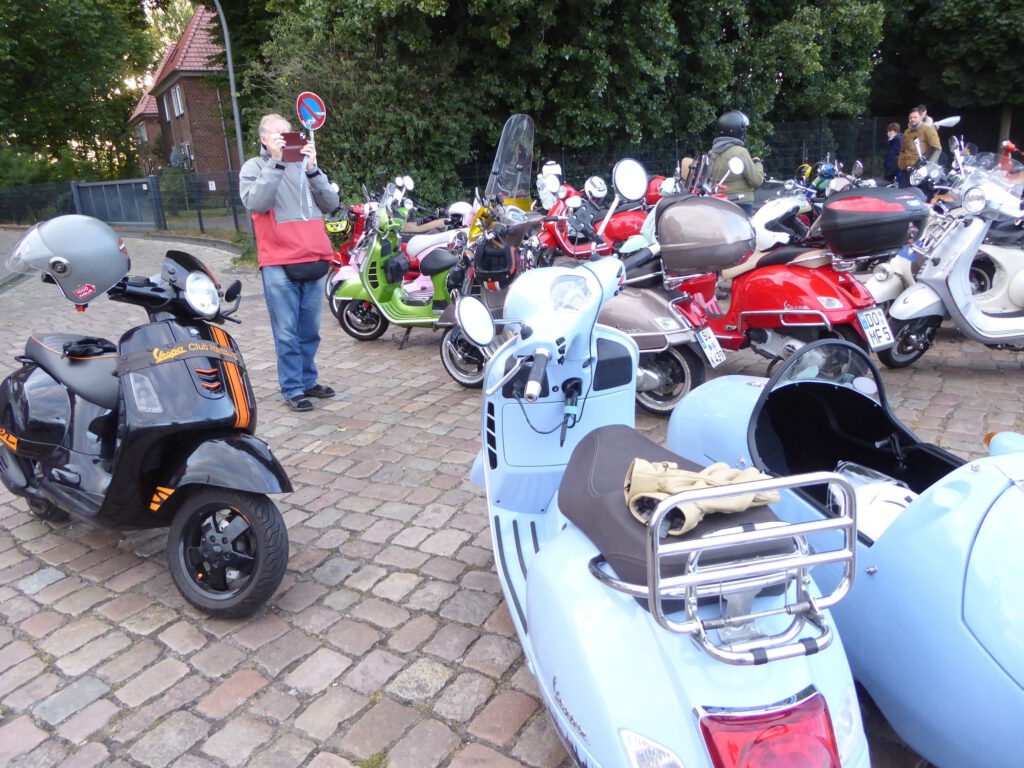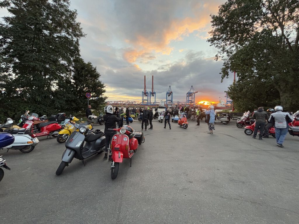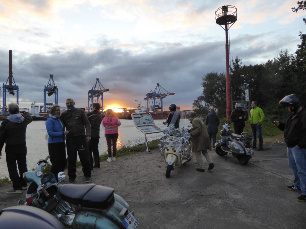 Einige von uns haben sich bei der Freiluftschule im Moorwerder Hauptdeich eingefunden, um mit dem VC Hamburg zu feiern. Das Gelände ist nicht nur schön gelegen, sondern bot gute Voraussetzungen mit Raum für eine Ausstellung, Geschicklichkeitsturnier etc. – bis dahin wusste ich nicht einmal, was eine Freiluftschule ist. Sogar ein Hallenbad stand zeitweise zur Verfügung, wurde aber leider kaum angenommen, weil das Wetter alle draußen hielt, wo es von der Elektro-PX über T-Shirt-Druck, Musik und Verköstigung viel zu bestaunen und zu genießen gab. Besondere Highlights waren auch die Ausfahrten, die Cordelia und mich zur passenden Zeit (Sonnenuntergang) an schöne Orte geführt haben, die auch wir als Hamburg-Bewohner nicht alle kannten. Pfiffig war die Corso-Fahrt, die als Demonstration für mehr Sicherheit im Straßenverkehr angemeldet war, und daher Begleitung von Polizei-Motorrädern hatte. Der NDR zeigte dann auch Bilder vom Treffen und der „Demo“. Die Motorrad-Polizisten haben sich nach dem Corso noch am Parcours versucht und sich mit den ausgeliehenen Rollern gut geschlagen.