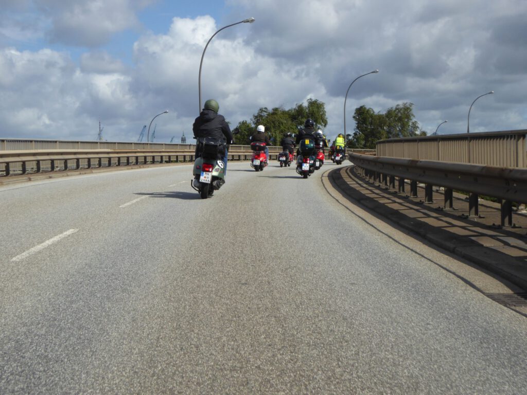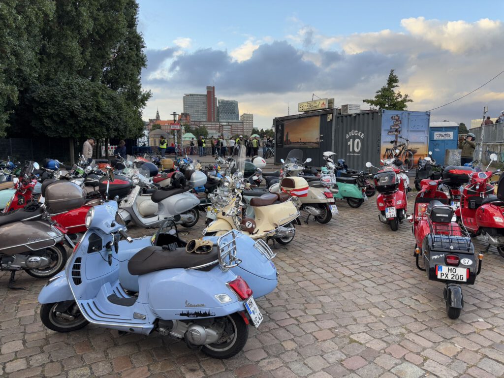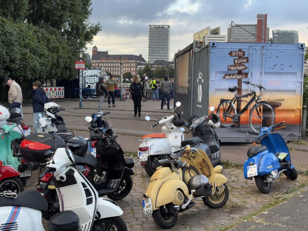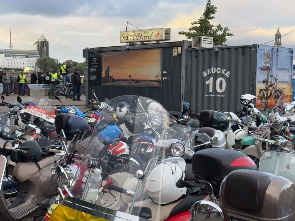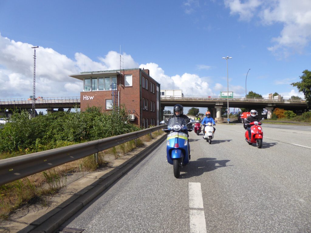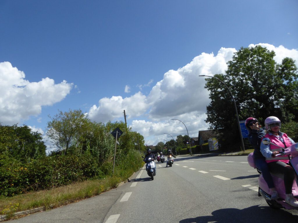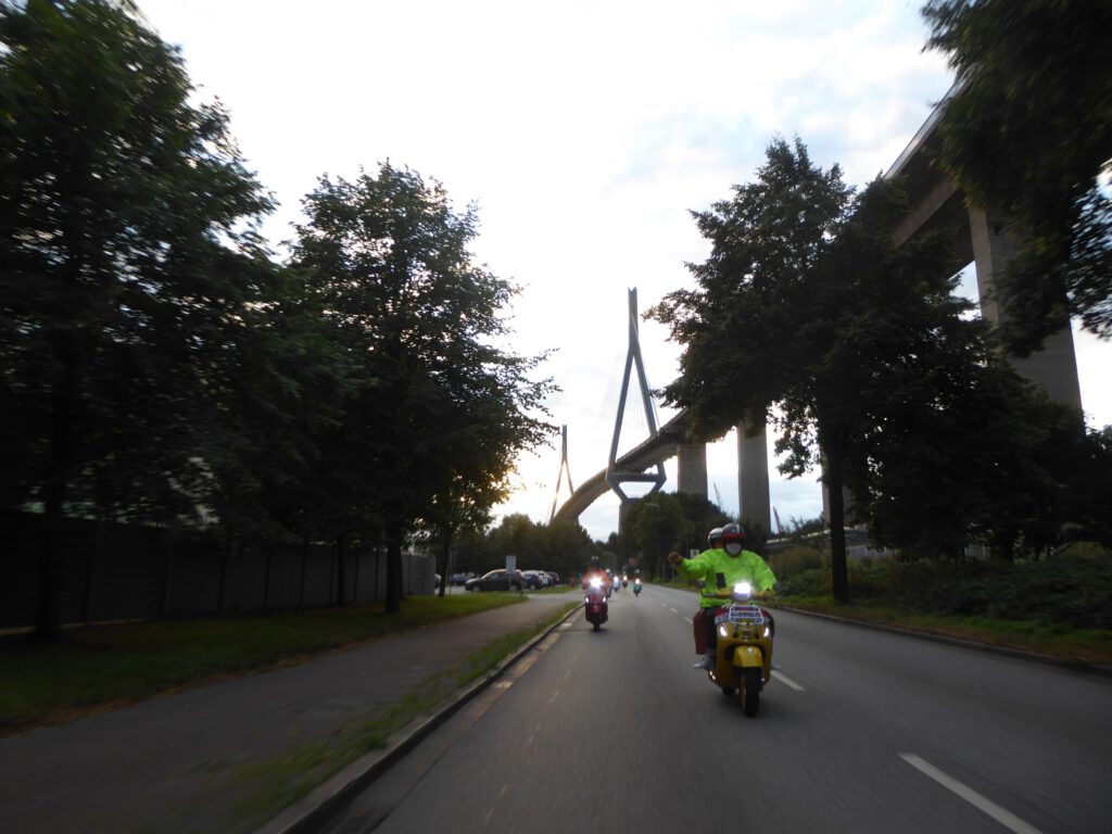 Einige von uns haben sich bei der Freiluftschule im Moorwerder Hauptdeich eingefunden, um mit dem VC Hamburg zu feiern. Das Gelände ist nicht nur schön gelegen, sondern bot gute Voraussetzungen mit Raum für eine Ausstellung, Geschicklichkeitsturnier etc. – bis dahin wusste ich nicht einmal, was eine Freiluftschule ist. Sogar ein Hallenbad stand zeitweise zur Verfügung, wurde aber leider kaum angenommen, weil das Wetter alle draußen hielt, wo es von der Elektro-PX über T-Shirt-Druck, Musik und Verköstigung viel zu bestaunen und zu genießen gab. Besondere Highlights waren auch die Ausfahrten, die Cordelia und mich zur passenden Zeit (Sonnenuntergang) an schöne Orte geführt haben, die auch wir als Hamburg-Bewohner nicht alle kannten. Pfiffig war die Corso-Fahrt, die als Demonstration für mehr Sicherheit im Straßenverkehr angemeldet war, und daher Begleitung von Polizei-Motorrädern hatte. Der NDR zeigte dann auch Bilder vom Treffen und der „Demo“. Die Motorrad-Polizisten haben sich nach dem Corso noch am Parcours versucht und sich mit den ausgeliehenen Rollern gut geschlagen.