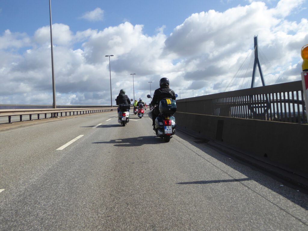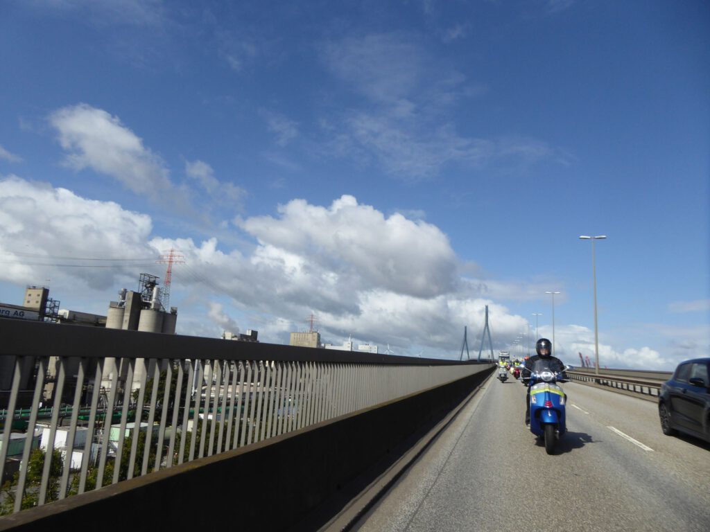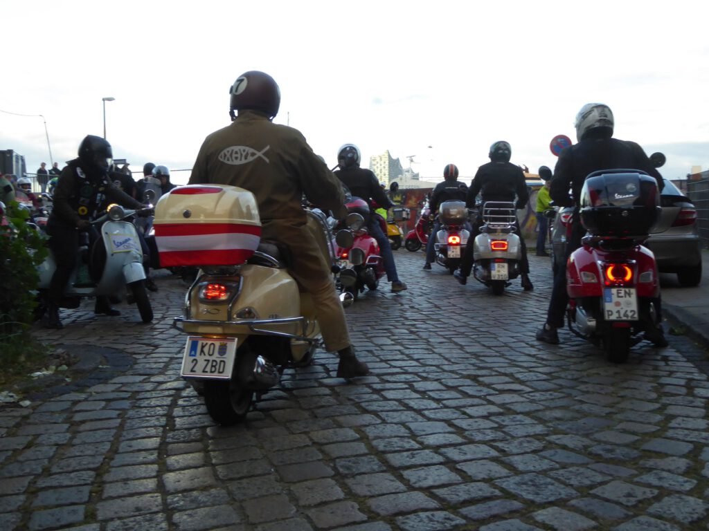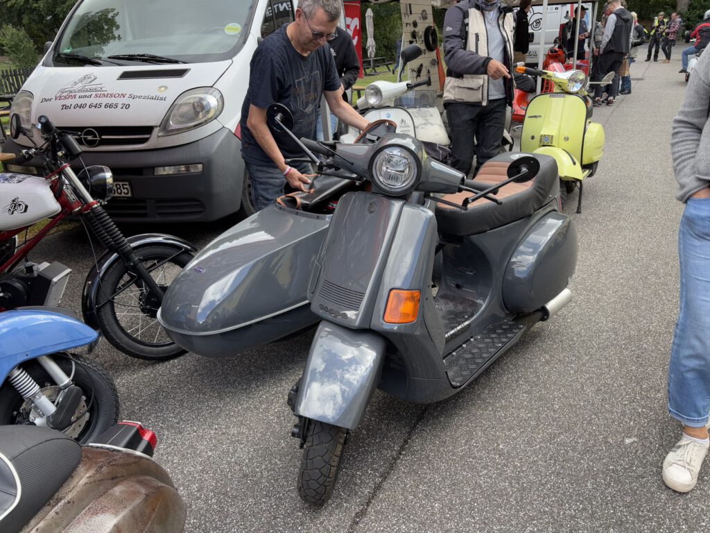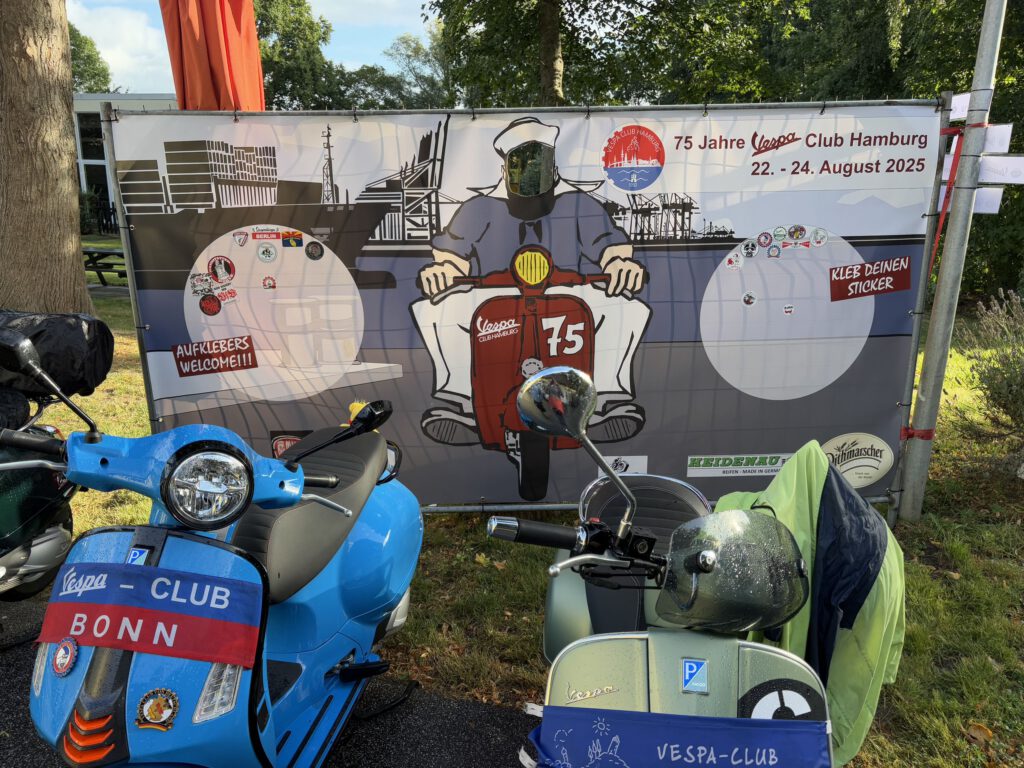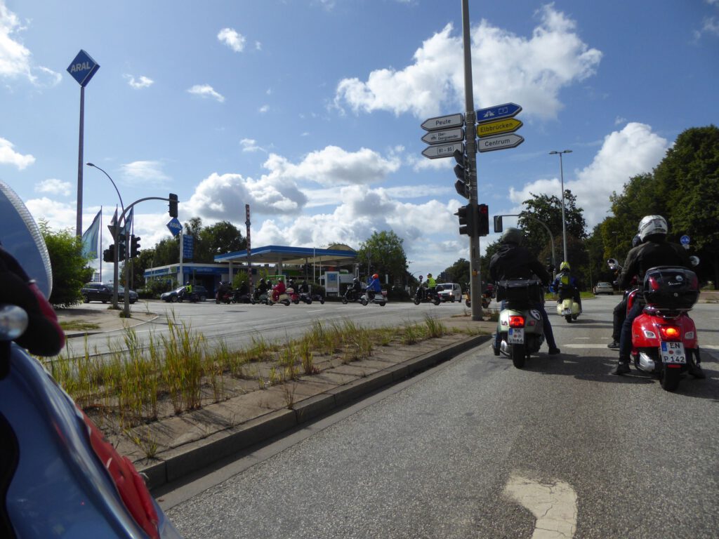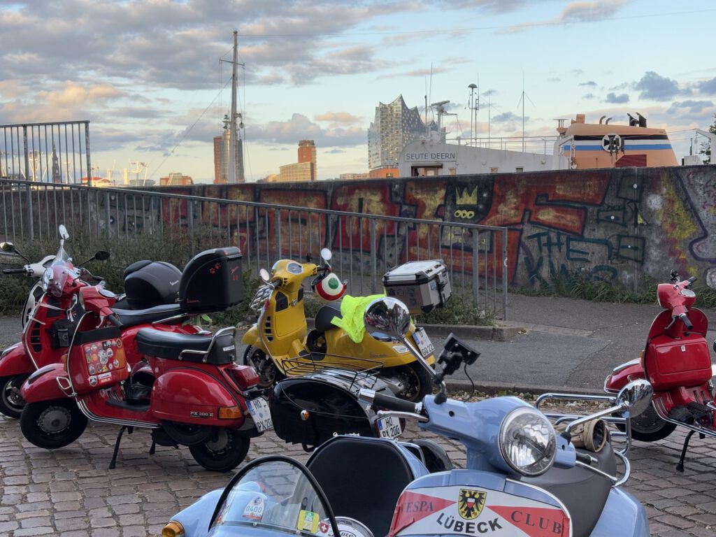 Einige von uns haben sich bei der Freiluftschule im Moorwerder Hauptdeich eingefunden, um mit dem VC Hamburg zu feiern. Das Gelände ist nicht nur schön gelegen, sondern bot gute Voraussetzungen mit Raum für eine Ausstellung, Geschicklichkeitsturnier etc. – bis dahin wusste ich nicht einmal, was eine Freiluftschule ist. Sogar ein Hallenbad stand zeitweise zur Verfügung, wurde aber leider kaum angenommen, weil das Wetter alle draußen hielt, wo es von der Elektro-PX über T-Shirt-Druck, Musik und Verköstigung viel zu bestaunen und zu genießen gab. Besondere Highlights waren auch die Ausfahrten, die Cordelia und mich zur passenden Zeit (Sonnenuntergang) an schöne Orte geführt haben, die auch wir als Hamburg-Bewohner nicht alle kannten. Pfiffig war die Corso-Fahrt, die als Demonstration für mehr Sicherheit im Straßenverkehr angemeldet war, und daher Begleitung von Polizei-Motorrädern hatte. Der NDR zeigte dann auch Bilder vom Treffen und der „Demo“. Die Motorrad-Polizisten haben sich nach dem Corso noch am Parcours versucht und sich mit den ausgeliehenen Rollern gut geschlagen.