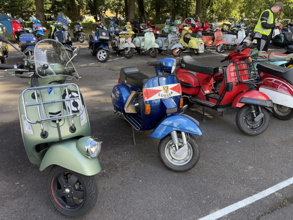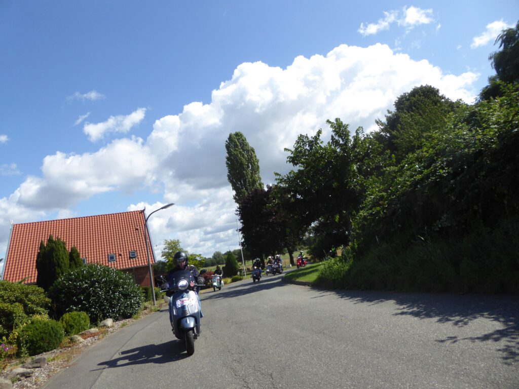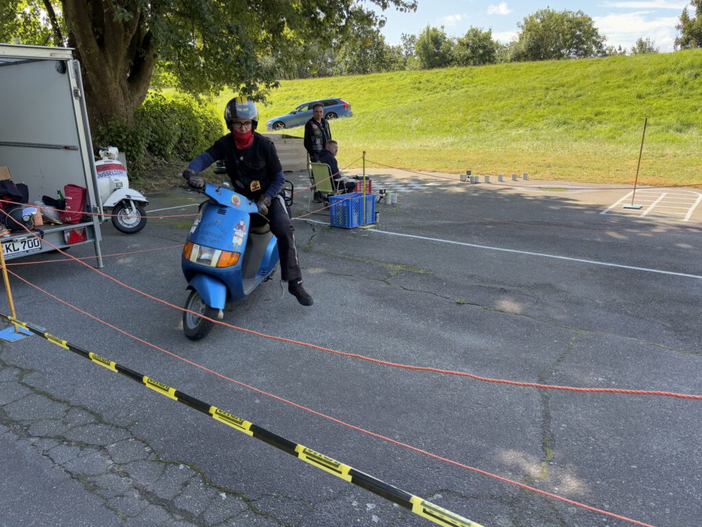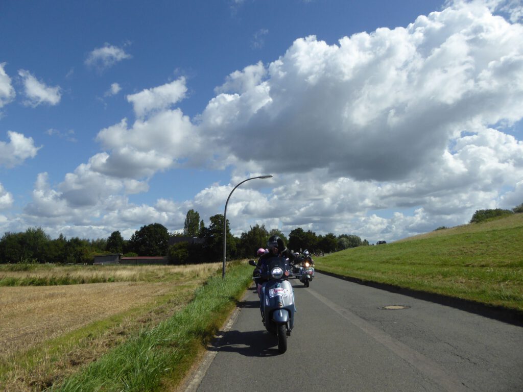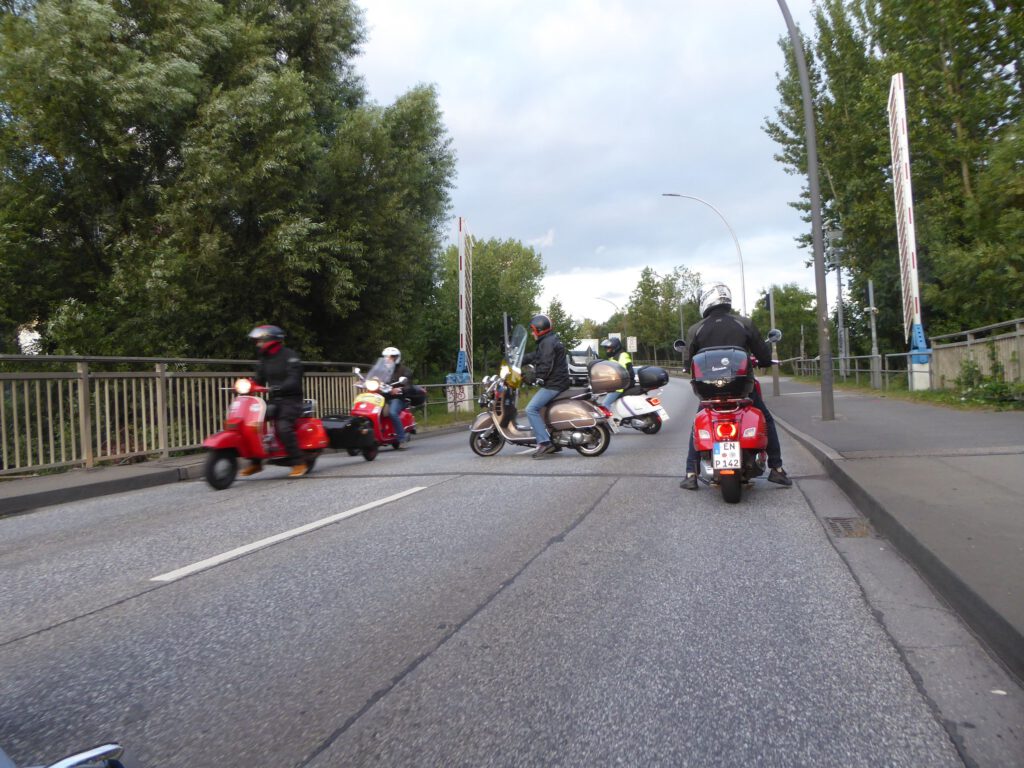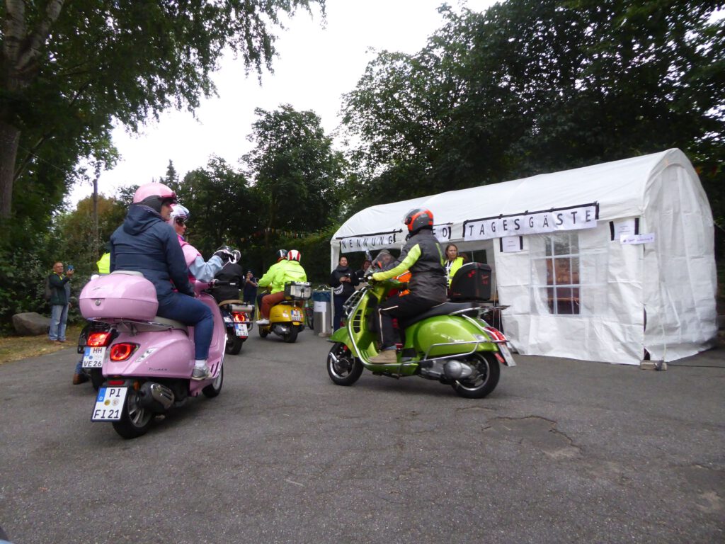 Einige von uns haben sich bei der Freiluftschule im Moorwerder Hauptdeich eingefunden, um mit dem VC Hamburg zu feiern. Das Gelände ist nicht nur schön gelegen, sondern bot gute Voraussetzungen mit Raum für eine Ausstellung, Geschicklichkeitsturnier etc. – bis dahin wusste ich nicht einmal, was eine Freiluftschule ist. Sogar ein Hallenbad stand zeitweise zur Verfügung, wurde aber leider kaum angenommen, weil das Wetter alle draußen hielt, wo es von der Elektro-PX über T-Shirt-Druck, Musik und Verköstigung viel zu bestaunen und zu genießen gab. Besondere Highlights waren auch die Ausfahrten, die Cordelia und mich zur passenden Zeit (Sonnenuntergang) an schöne Orte geführt haben, die auch wir als Hamburg-Bewohner nicht alle kannten. Pfiffig war die Corso-Fahrt, die als Demonstration für mehr Sicherheit im Straßenverkehr angemeldet war, und daher Begleitung von Polizei-Motorrädern hatte. Der NDR zeigte dann auch Bilder vom Treffen und der „Demo“. Die Motorrad-Polizisten haben sich nach dem Corso noch am Parcours versucht und sich mit den ausgeliehenen Rollern gut geschlagen.