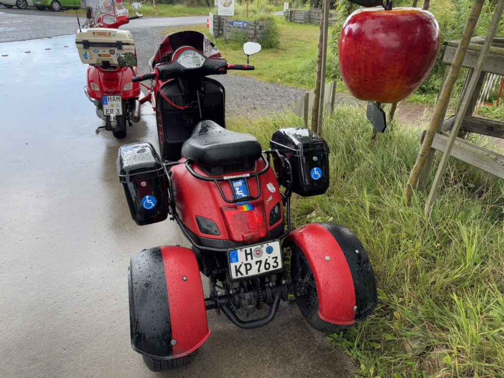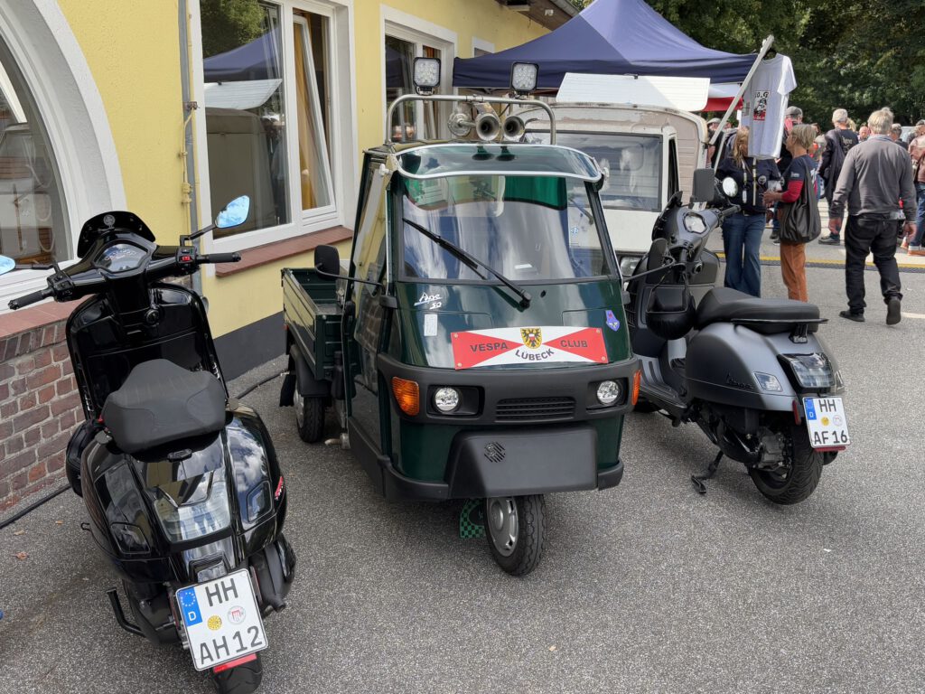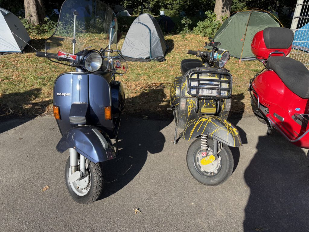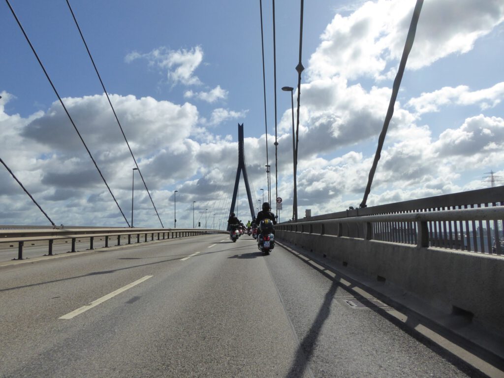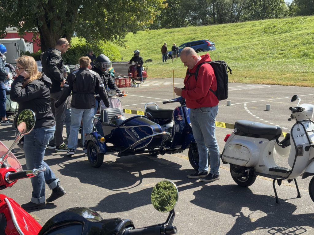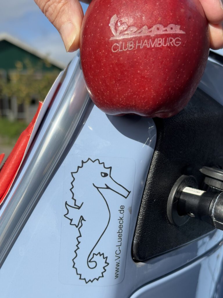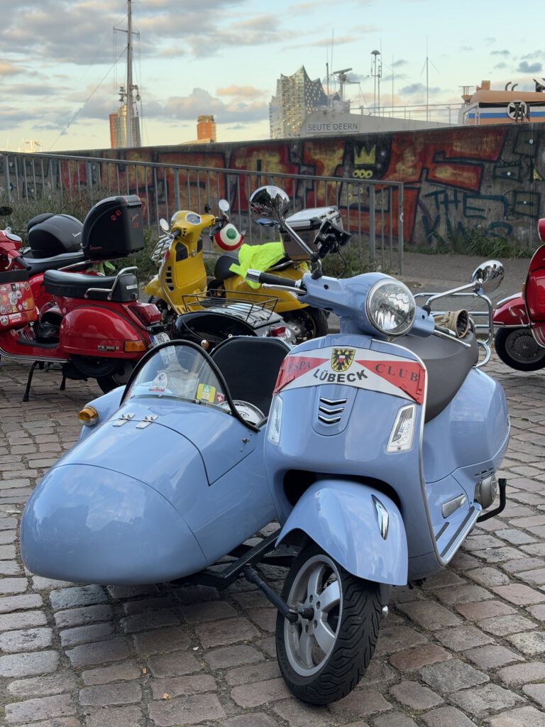 Einige von uns haben sich bei der Freiluftschule im Moorwerder Hauptdeich eingefunden, um mit dem VC Hamburg zu feiern. Das Gelände ist nicht nur schön gelegen, sondern bot gute Voraussetzungen mit Raum für eine Ausstellung, Geschicklichkeitsturnier etc. – bis dahin wusste ich nicht einmal, was eine Freiluftschule ist. Sogar ein Hallenbad stand zeitweise zur Verfügung, wurde aber leider kaum angenommen, weil das Wetter alle draußen hielt, wo es von der Elektro-PX über T-Shirt-Druck, Musik und Verköstigung viel zu bestaunen und zu genießen gab. Besondere Highlights waren auch die Ausfahrten, die Cordelia und mich zur passenden Zeit (Sonnenuntergang) an schöne Orte geführt haben, die auch wir als Hamburg-Bewohner nicht alle kannten. Pfiffig war die Corso-Fahrt, die als Demonstration für mehr Sicherheit im Straßenverkehr angemeldet war, und daher Begleitung von Polizei-Motorrädern hatte. Der NDR zeigte dann auch Bilder vom Treffen und der „Demo“. Die Motorrad-Polizisten haben sich nach dem Corso noch am Parcours versucht und sich mit den ausgeliehenen Rollern gut geschlagen.