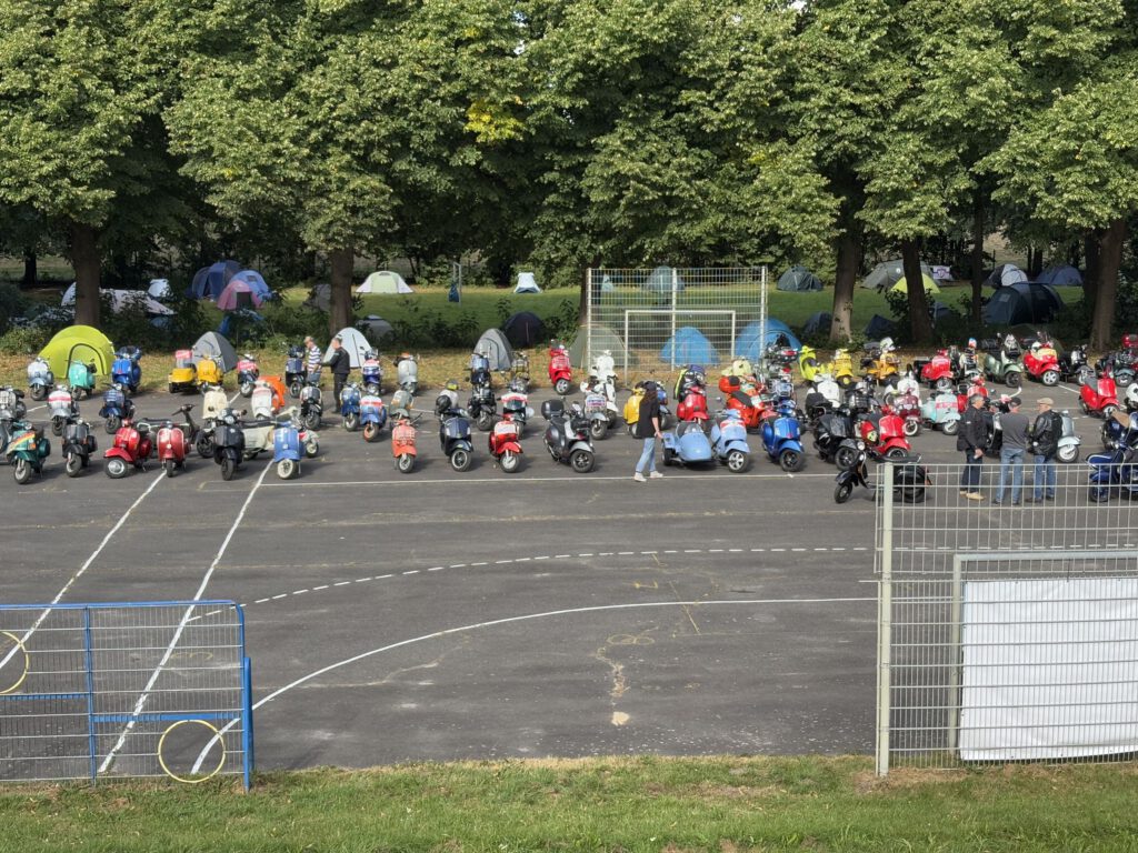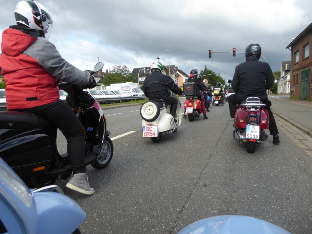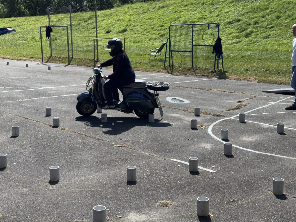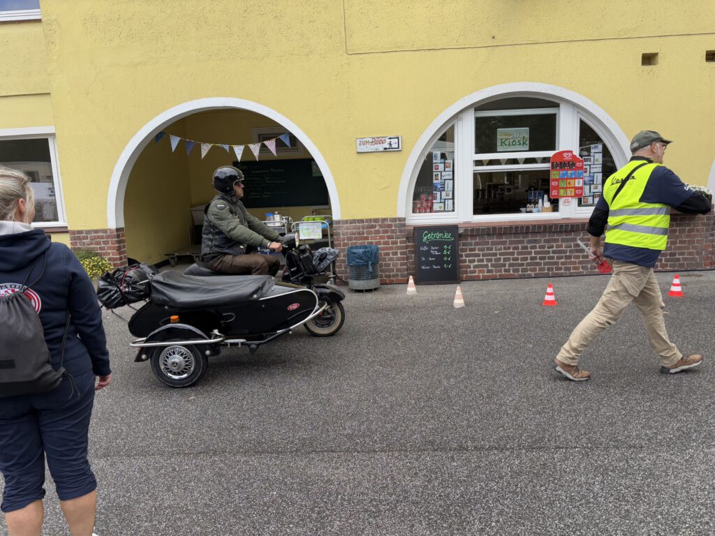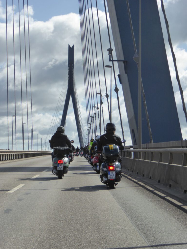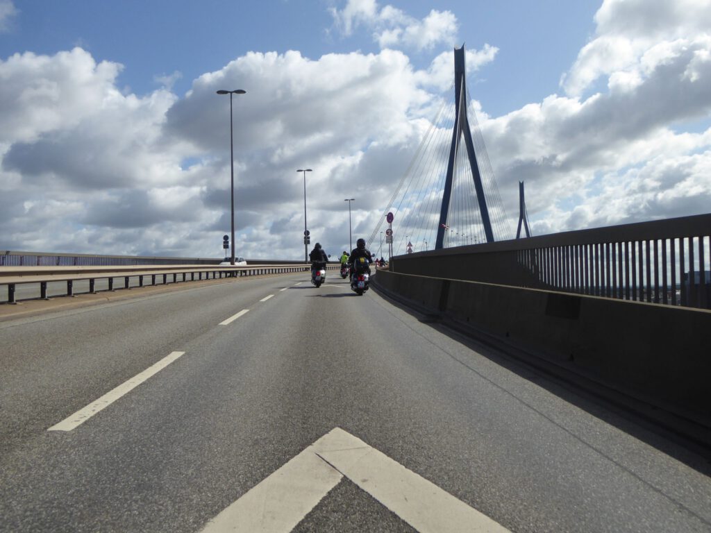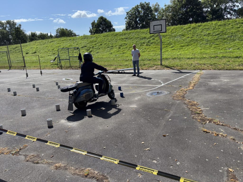 Einige von uns haben sich bei der Freiluftschule im Moorwerder Hauptdeich eingefunden, um mit dem VC Hamburg zu feiern. Das Gelände ist nicht nur schön gelegen, sondern bot gute Voraussetzungen mit Raum für eine Ausstellung, Geschicklichkeitsturnier etc. – bis dahin wusste ich nicht einmal, was eine Freiluftschule ist. Sogar ein Hallenbad stand zeitweise zur Verfügung, wurde aber leider kaum angenommen, weil das Wetter alle draußen hielt, wo es von der Elektro-PX über T-Shirt-Druck, Musik und Verköstigung viel zu bestaunen und zu genießen gab. Besondere Highlights waren auch die Ausfahrten, die Cordelia und mich zur passenden Zeit (Sonnenuntergang) an schöne Orte geführt haben, die auch wir als Hamburg-Bewohner nicht alle kannten. Pfiffig war die Corso-Fahrt, die als Demonstration für mehr Sicherheit im Straßenverkehr angemeldet war, und daher Begleitung von Polizei-Motorrädern hatte. Der NDR zeigte dann auch Bilder vom Treffen und der „Demo“. Die Motorrad-Polizisten haben sich nach dem Corso noch am Parcours versucht und sich mit den ausgeliehenen Rollern gut geschlagen.